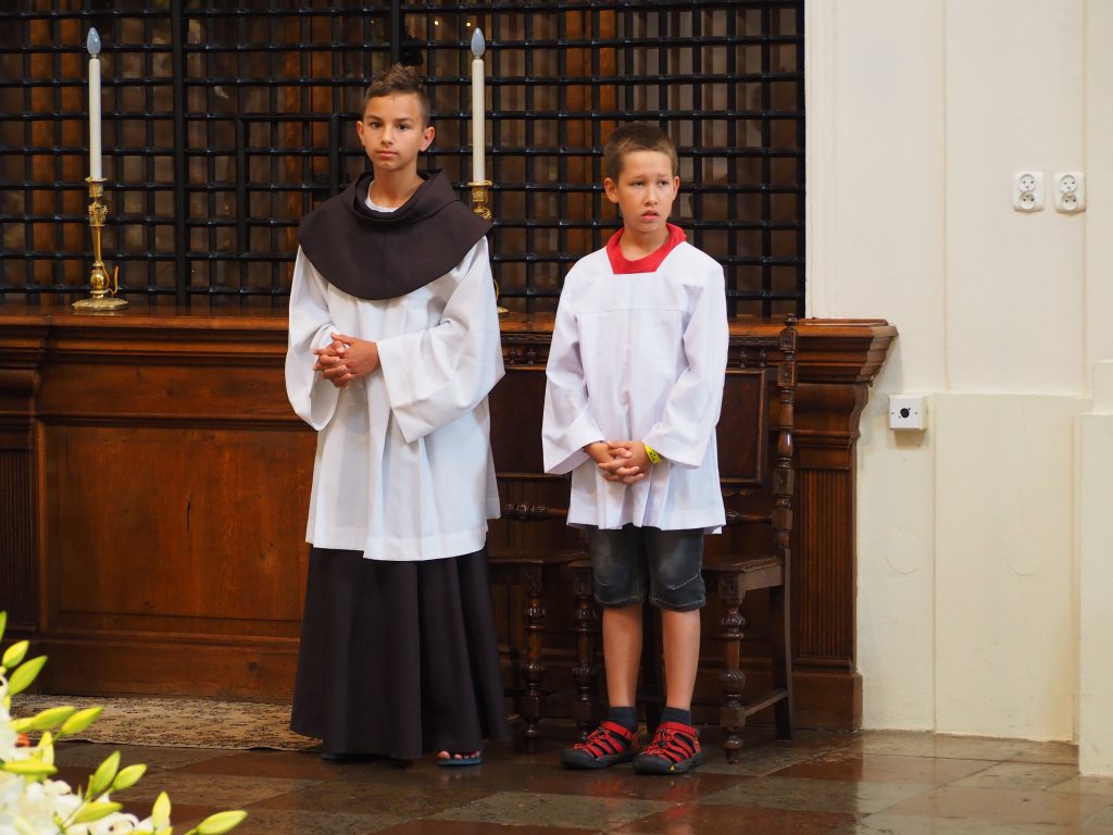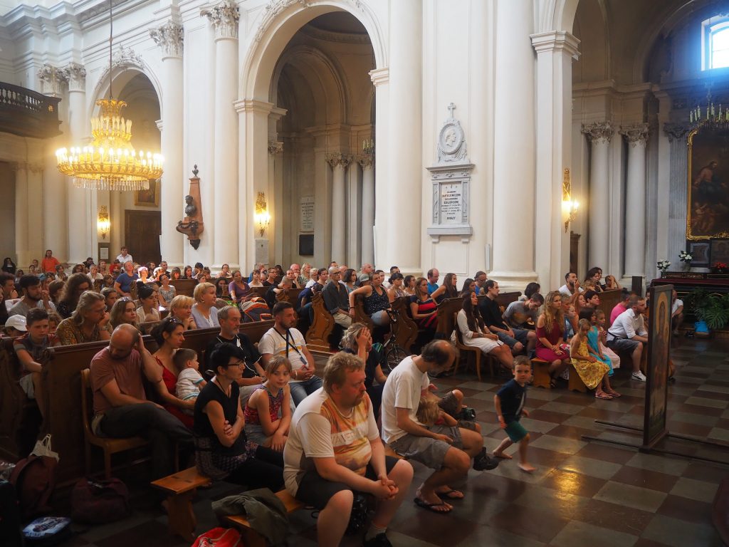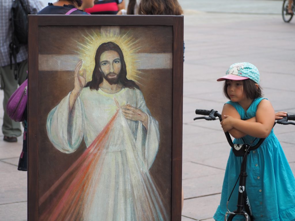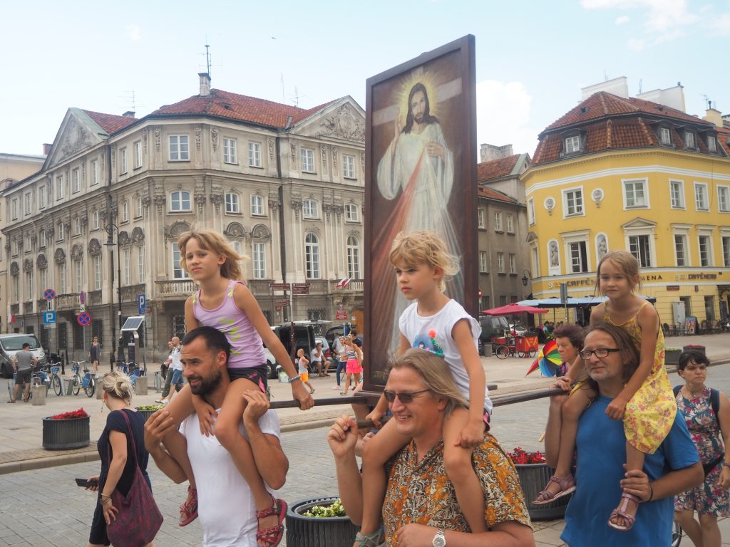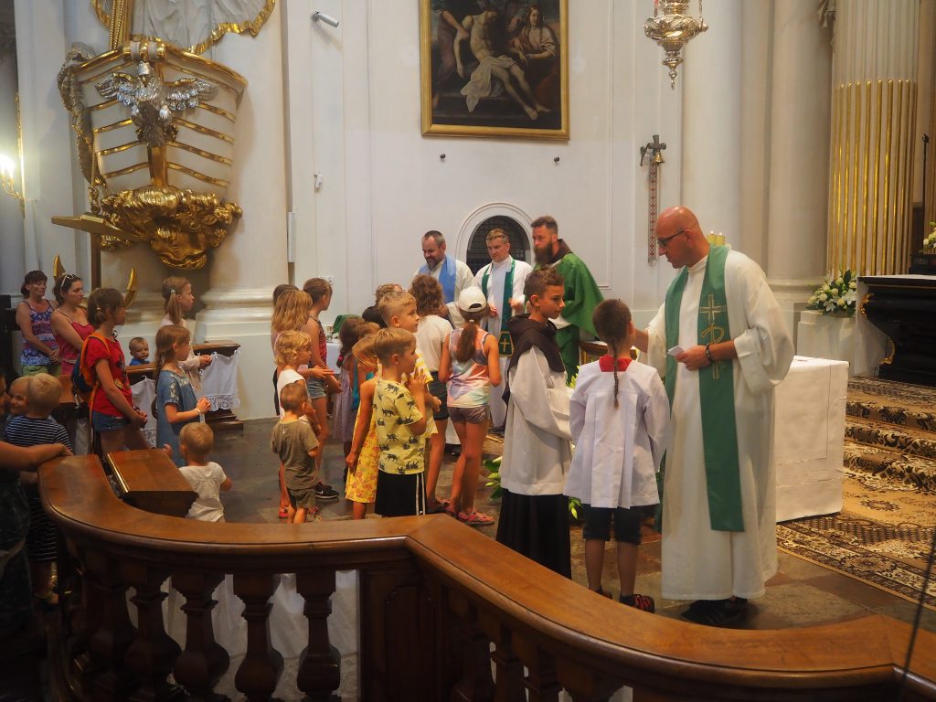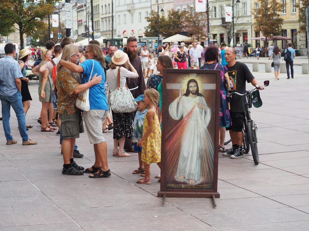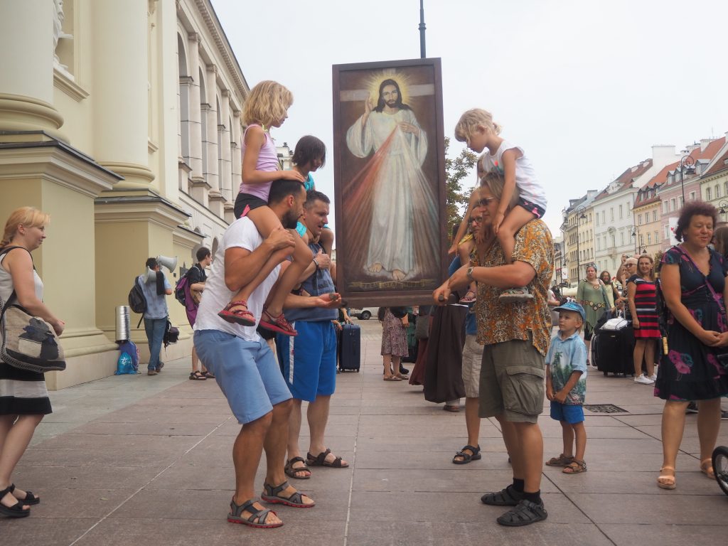 Pielgrzymi spotkali się przed kolegiatą św. Anny, skąd ruszyli do kościoła sióstr Wizytek. Obraz Jezusa Miłosiernego nieśli ojcowie, trzymając na ramionach swoje dzieci. Wśród pątników byli uczestnicy pierwszych pielgrzymek, rodziny z dziećmi, niektórzy uczestniczyć w tej pielgrzymce będą pierwszy raz. Wiele osób dołączać będzie podczas trasy. Mszy przewodniczył o. Kordian Szwarc OFM, koncelebrowało kilku księży.