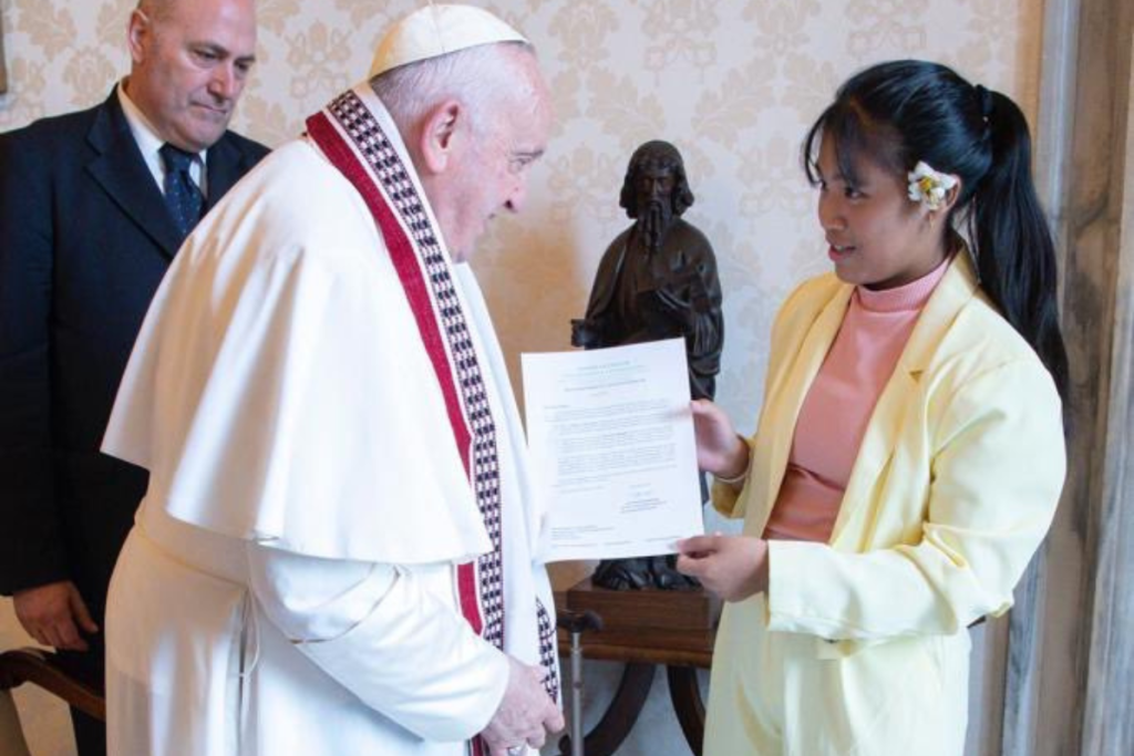 W rozmowie z papieżem Licypriya Kangujam opowiedziała o aktach przemocy w Manipurze i wręczyła mu dokument o “Wychowaniu klimatycznym”, które ma być nauczane we wszystkich szkołach katolickich i w instytucjach misyjnych na świecie. Dodała, że nie będzie “rozwiązania” problemu środowiska, jeśli nie będzie jednocześnie “wychowania” do tej tematyki. Podkreśliła również, iż papież “swoim autorytatywnym wystąpieniem” umożliwi “powstrzymanie przemocy” między wspólnotami Kuki a tubylcami Meitei w jej stanie. Zwróciła uwagę, że ucierpiały obie te wspólnoty, kilkadziesiąt osób zginęło a co najmniej 80 tys. po obu stronach straciły swe domostwa w ciągu zaledwie miesiąca starć.