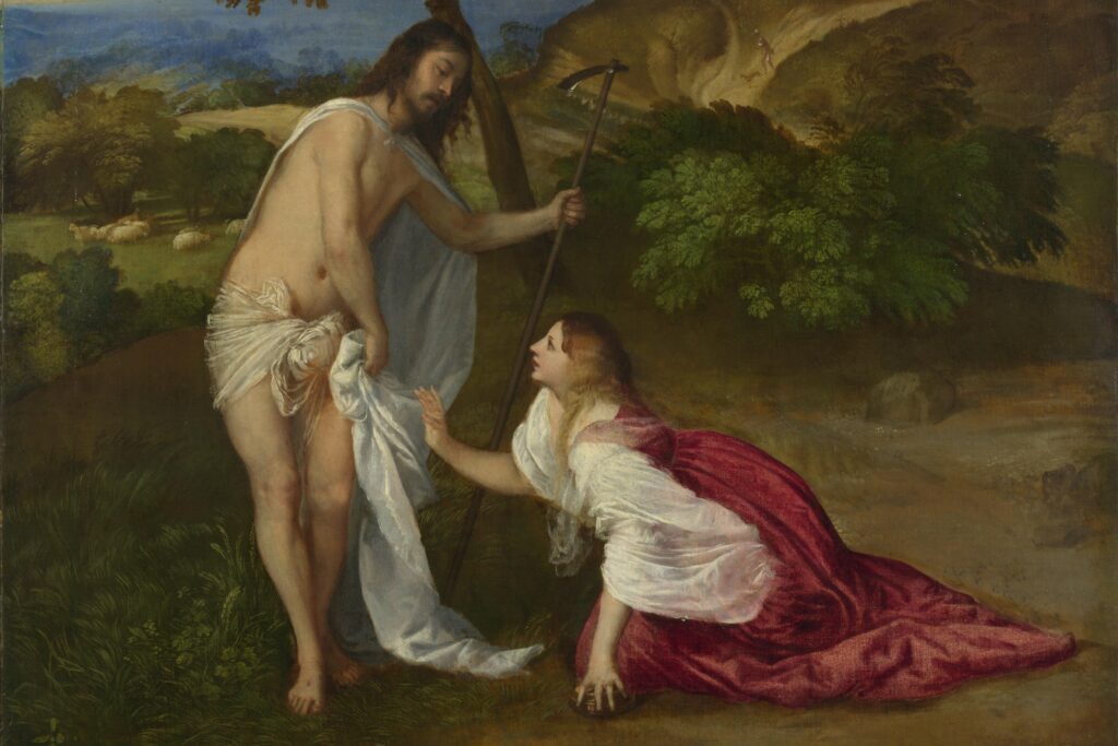 Poniżej obraz Tycjana (ok. 1488-1576) Noli Me tangere (ok. 1511-1512). Na obrazie widać Marię, która pada na kolana. Jezus natomiast jest okryty jedynie białym całunem, w którym został pochowany, za sobą ma błękit porannej zorzy zlewającej się z horyzontem tworząc wrażenie nieskończoności. Drzewo za postaciami symbolicznie rozdziela dwa światy i symbolizuje nowe życie. W ręku Jezusa Tycjan umieścił motykę, co miało nawiązywać do słów Ewangelisty, że Maria nie rozpoznała swego Pana, bo wzięła Go za ogrodnika. Magdalena w lewej ręce trzyma natomiast naczynie z wonnościami do namaszczenia. Pełen miłości wzrok Marii skierowany na Jezusa, daje wrażenie bliskości dwóch osób i radości ze spotkania. Jest tu nawiązanie do Pieśni nad pieśniami.