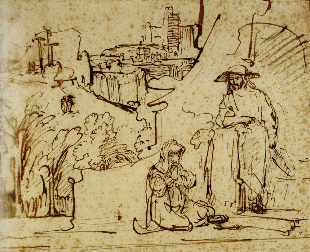 Ferdynand Bol (1616-1680). Ukazanie się Jezusa Marii Magdalenie. Na rysunku w oczy rzuca się kontrast między rozpaczą Marii Magdaleny, a swobodną postawą Jezusa (kapelusz, szpadel). Przez wiele lat rysunek był przypisywany Rembrandtowi. Panorama Jerozolimy rzeczywiście została skopiowana z jednego z obrazów Rembrandta.