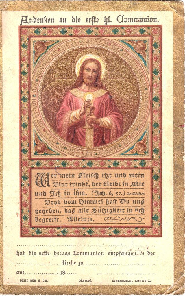 Jezus trzymający Hostię, „Chleb życia”, pojawia się także na pamiątkach przyjęcia I Komunii świętej. Na tej z końca XIX wieku pod wizerunkiem Chrystusa w szatach kapłańskich znajduje się cytat z Ewangelii św. Jana: „Kto spożywa moje Ciało i Krew moją pije, będzie żył przeze Mnie” (por. J 6, 57).