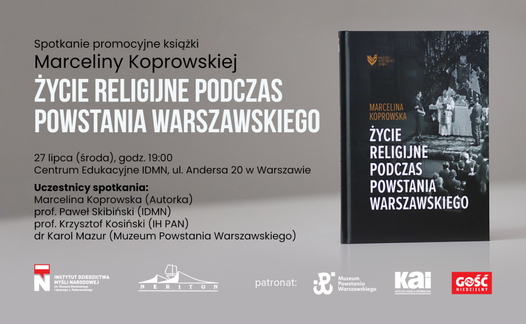 Materiały prasowe„Życie religijne podczas Powstania Warszawskiego” – Marceliny Koprowskiej to pierwsza synteza, poświęcona religijności i duchowości żołnierzy i ludności cywilnej, nie tylko katolików, ale także innych grup wyznaniowych. Publikacja ukazała się w serii wydawniczej Młodzi Historycy Instytutu Dziedzictwa Myśli Narodowej. Premiera odbędzie się 27 lipca w Warszawie.