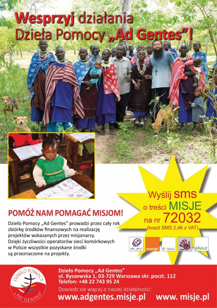 Dzieło Pomocy „Ad gentes” proponuje jako formę jałmużny wielkopostnej wysyłanie sms-a o treści „Misje” na numer 72032 (koszt 2,46 zł z VAT). – To niewielka ofiara z naszej strony, ale jakże bardzo skuteczna, gdy chodzi o wsparcie dzieł misyjnych. W ubiegłym roku zebraliśmy w ten sposób 171 709,52 zł, które przekazaliśmy już misjonarzom. Sms jest łatwą i szybką formą pomocy.