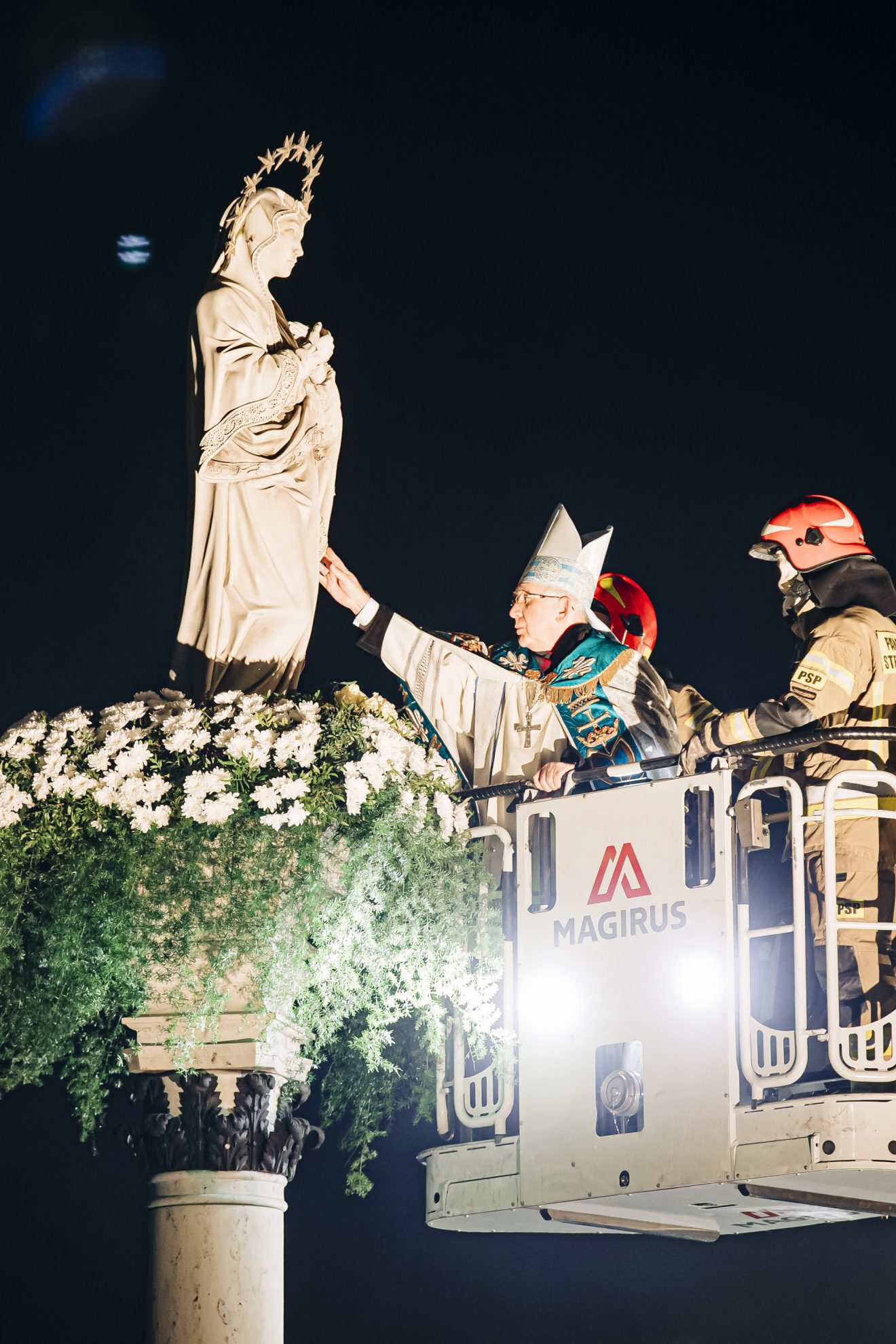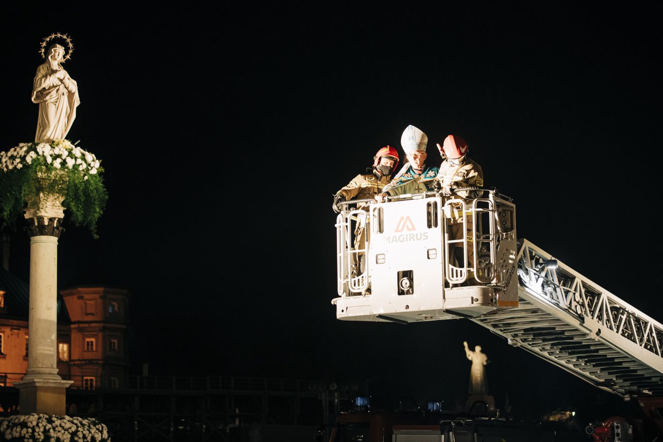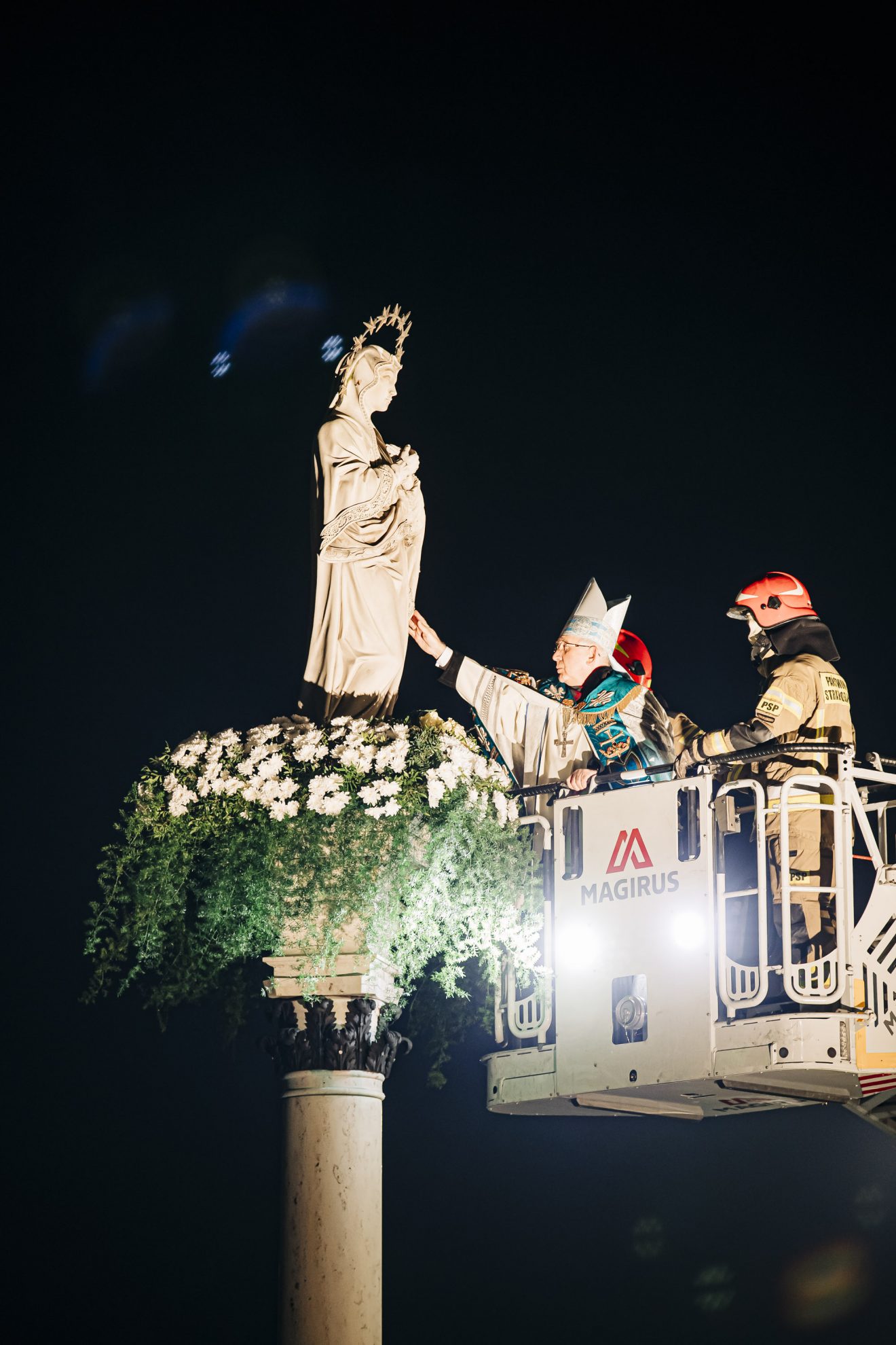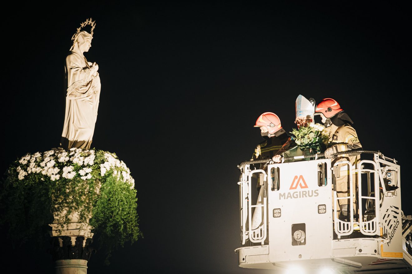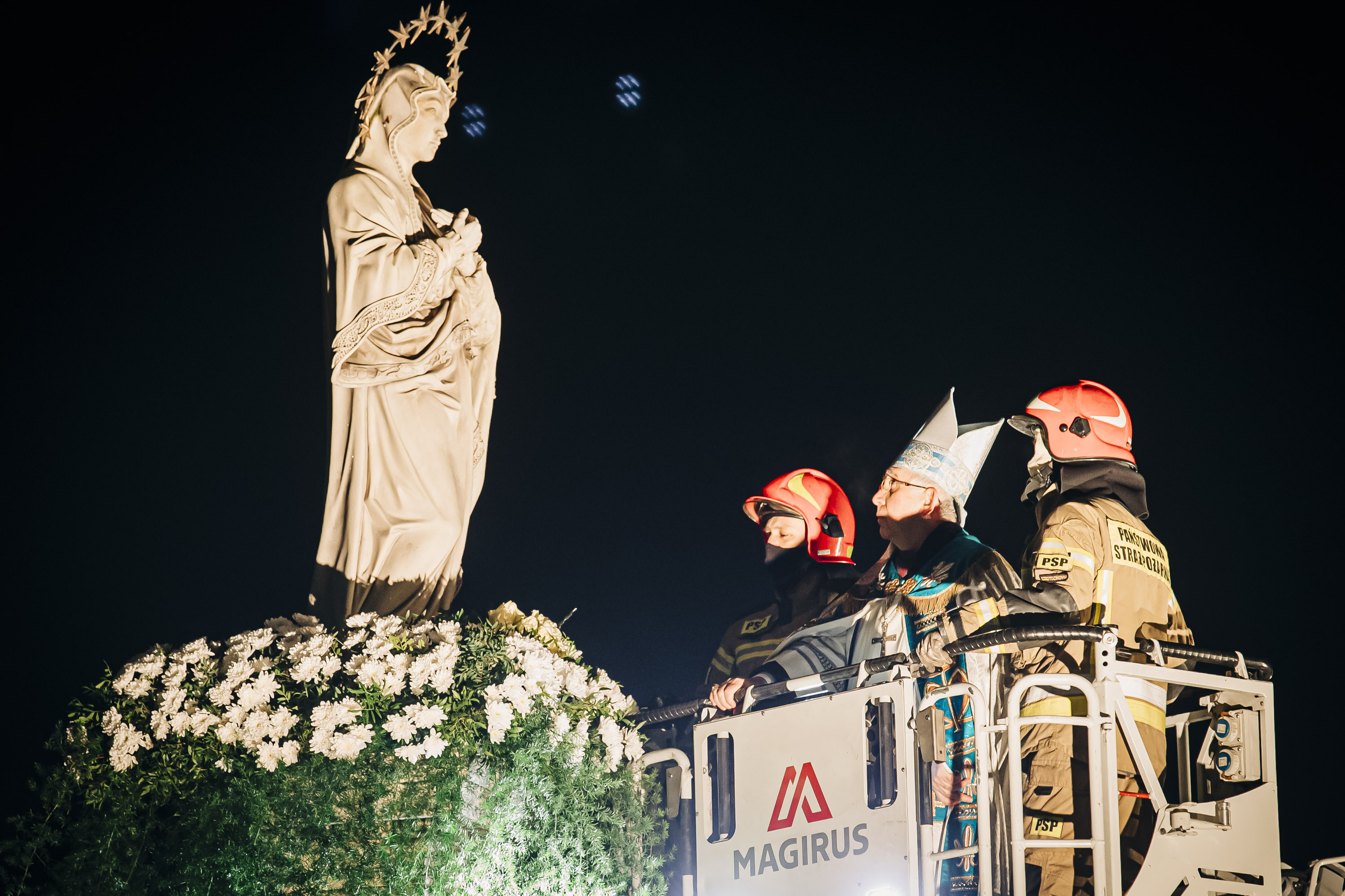 Następnie główny celebrans na podnośniku wozu strażackiego przygotowanego przez Państwową Straż Pożarną w Częstochowie został uniesiony na wysokość figury, gdzie złożył wiązankę z białych kwiatów.