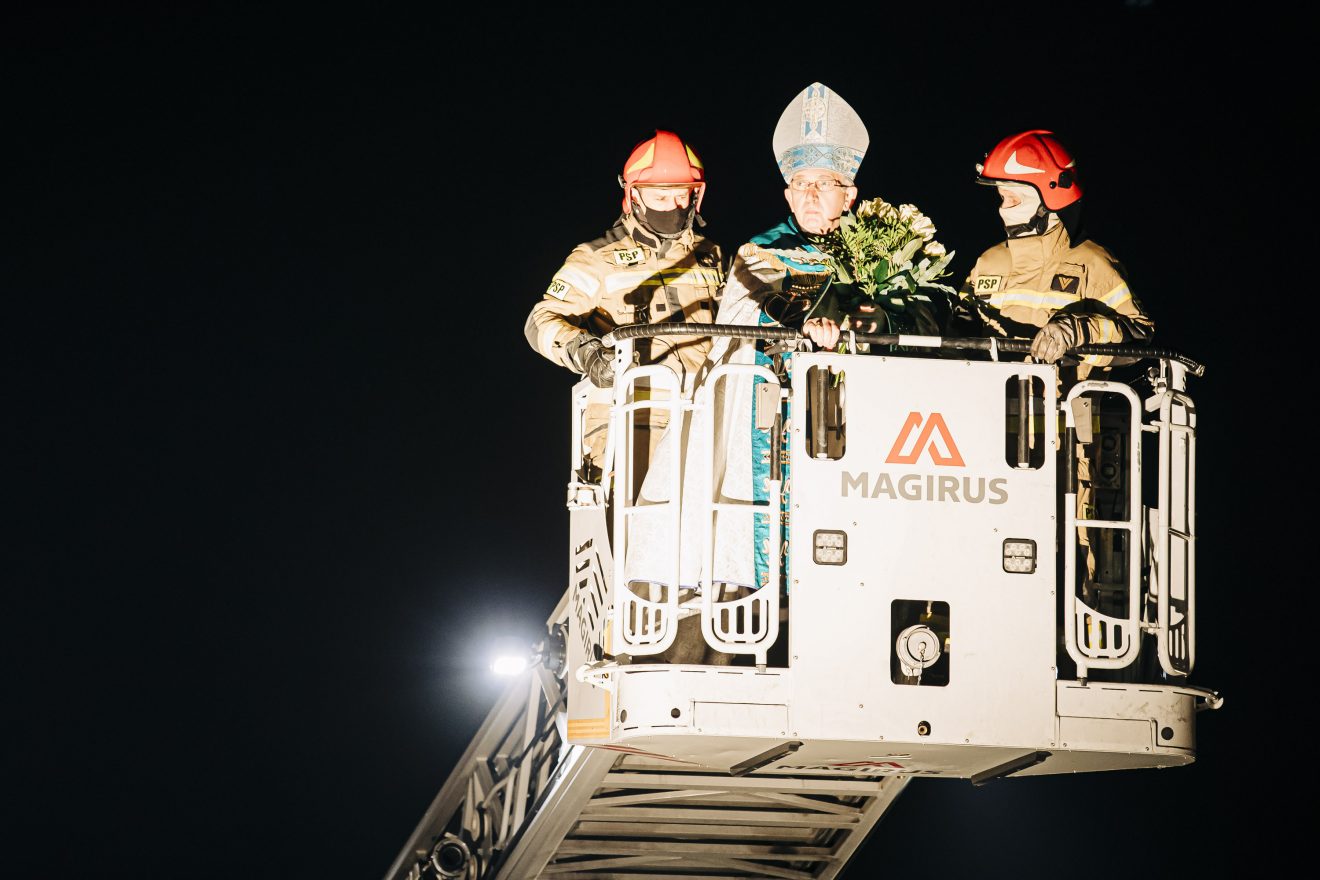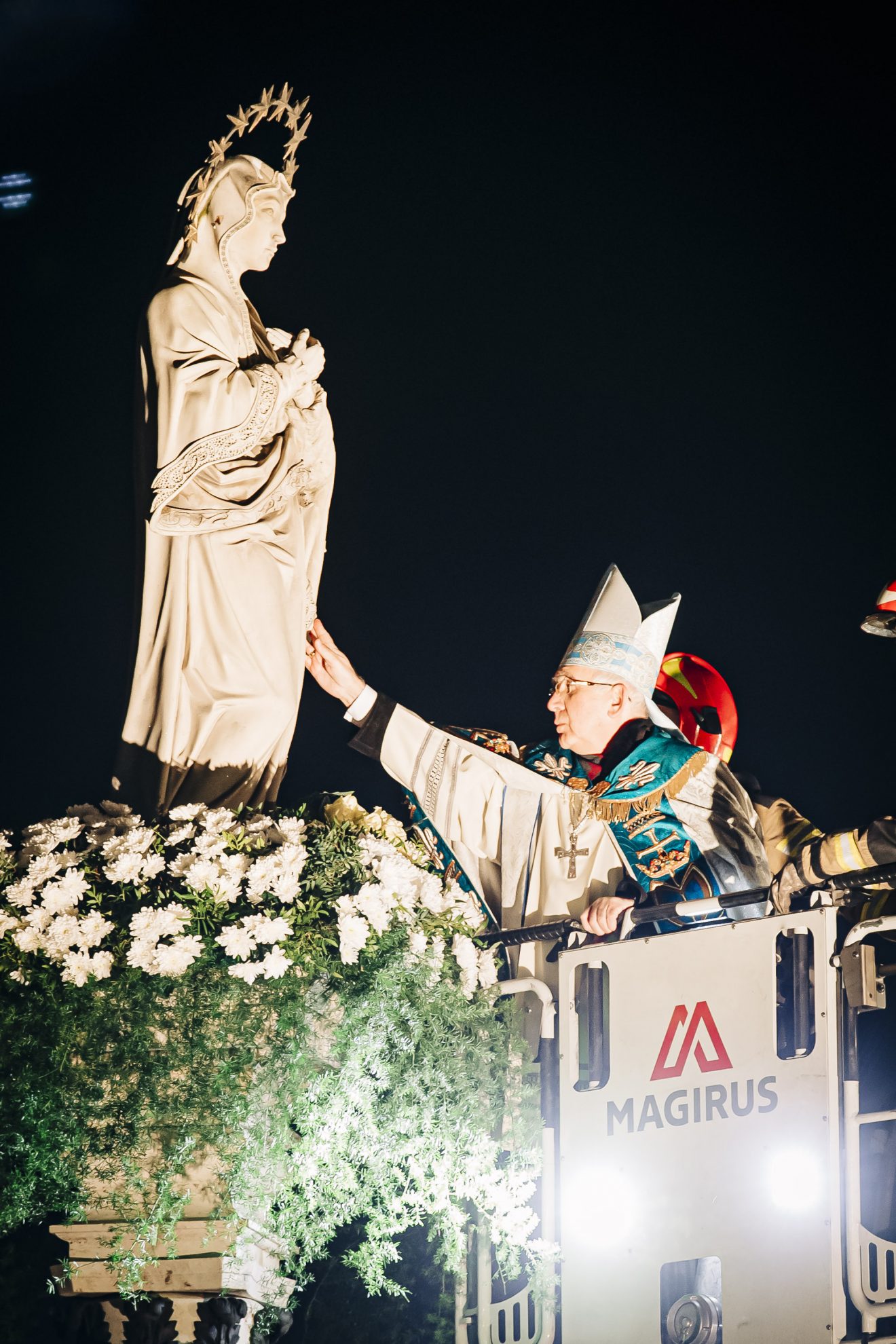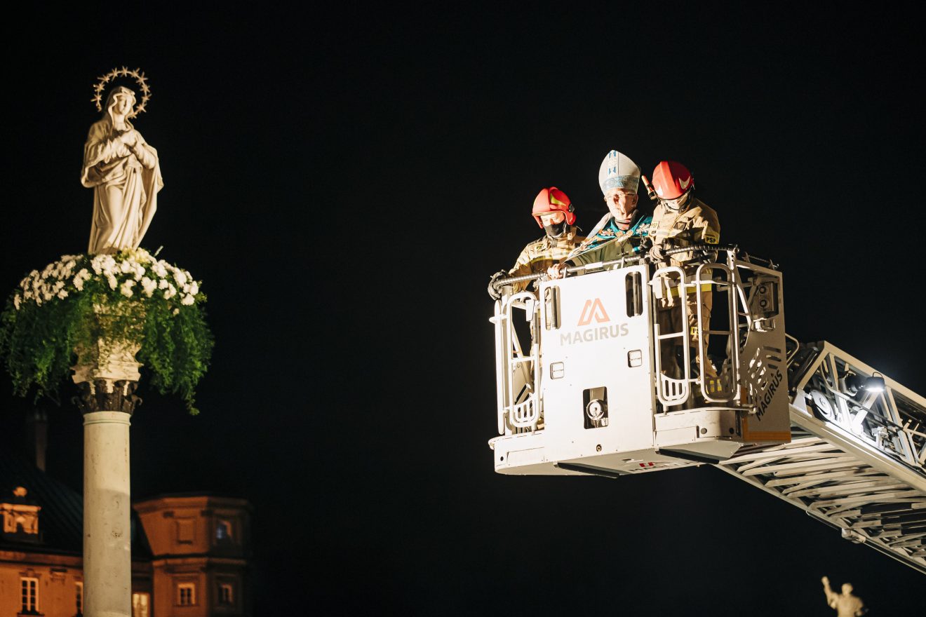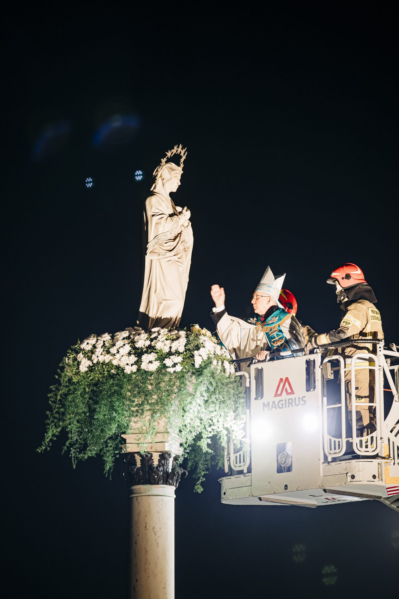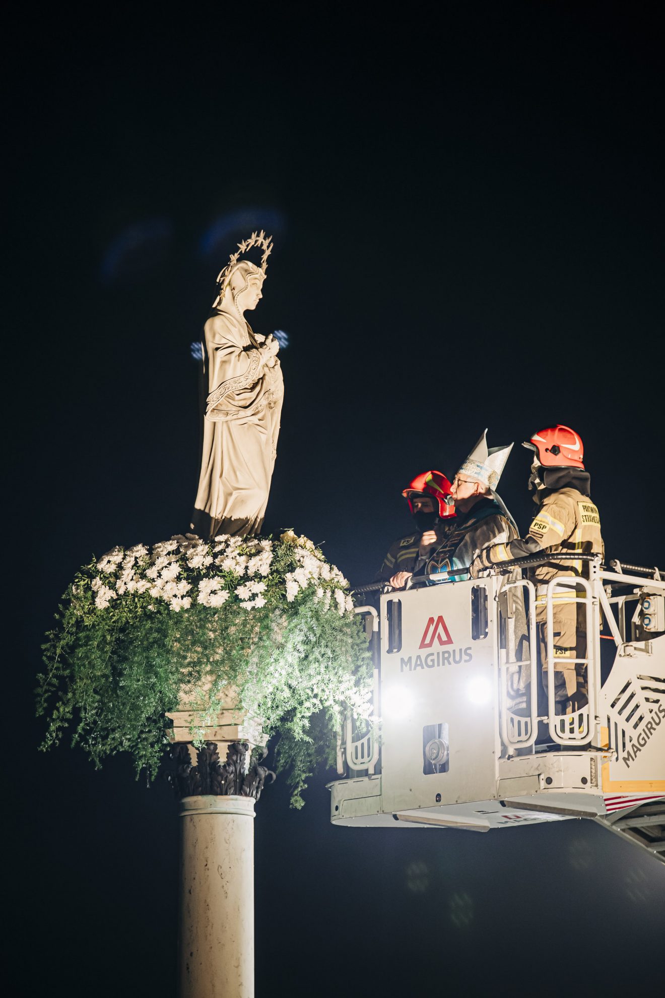 Następnie główny celebrans na podnośniku wozu strażackiego przygotowanego przez Państwową Straż Pożarną w Częstochowie został uniesiony na wysokość figury, gdzie złożył wiązankę z białych kwiatów.