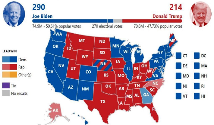 Czterdziestym szóstym prezydentem Stanów Zjednoczonych zostaje dopiero po raz drugi katolik. Joseph Biden zdobywając większość głosów w stanie Pensylwania, w którym się urodził, osiągnął przewagę głosów elektorskich zapewniających objęcie najwyższego urzędu w państwie. Przy wymaganych 270 na 538, uzyskał w tym momencie 290. Ogółem głosowało nań do tej chwili 74.872.570 wyborców, podczas gdy na Donalda Trumpa 70.601.968, co dało 214 głosów elektorskich.