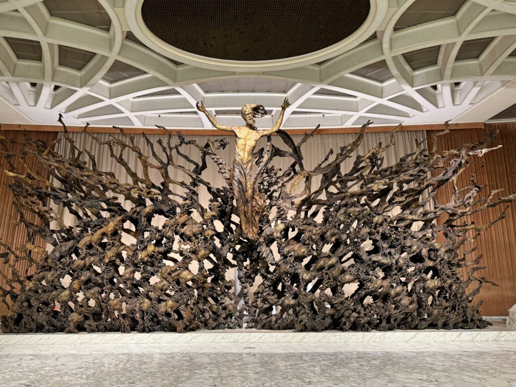 W Auli Pawła VI w oczy rzuca się rzeźba umieszczona w głębi podium. Dzieło wykonane przez włoskiego artystę Peryklesa Fazziniego, szerokie na 20 metrów i wysokie na 7 metrów ukazuje Chrystusa wynurzającego się z niewyraźnej masy chaosu i materii, zwycięskiego w walce ze śmiercią, zwracającego się do zgromadzonych w Auli w geście błogosławieństwa i jednocześnie kierującego wzrok ku niebu.