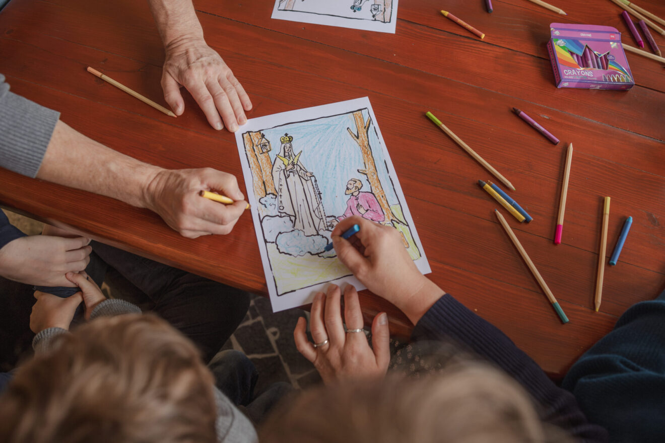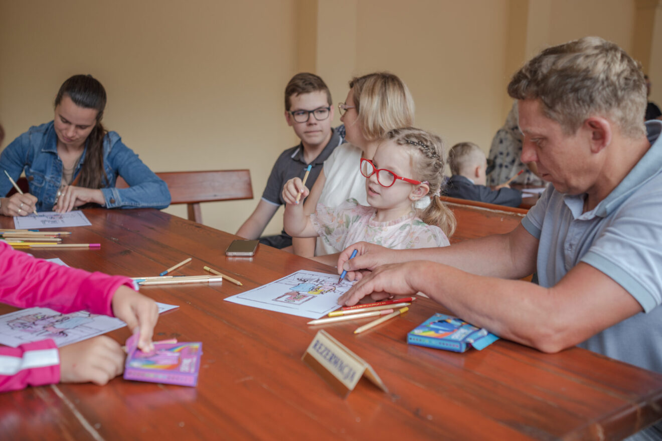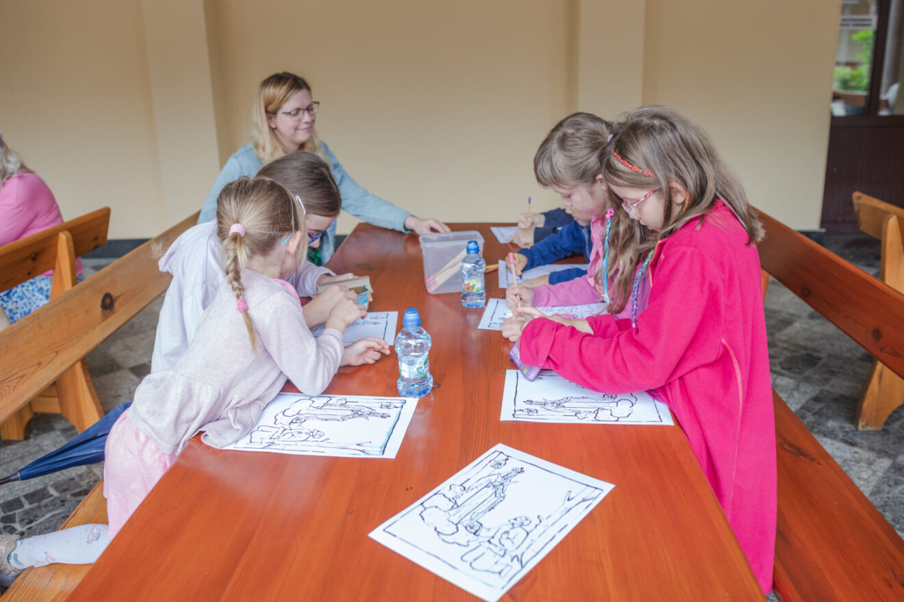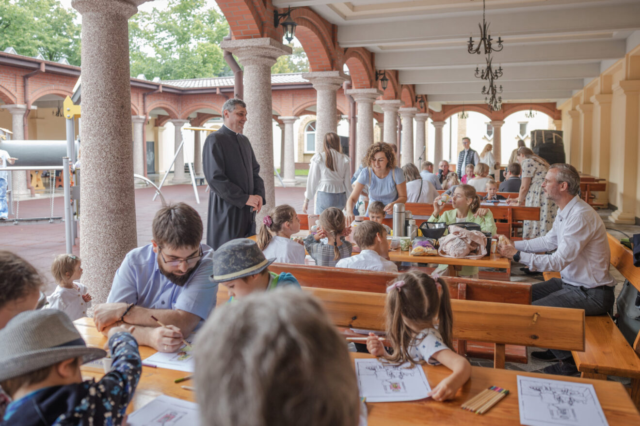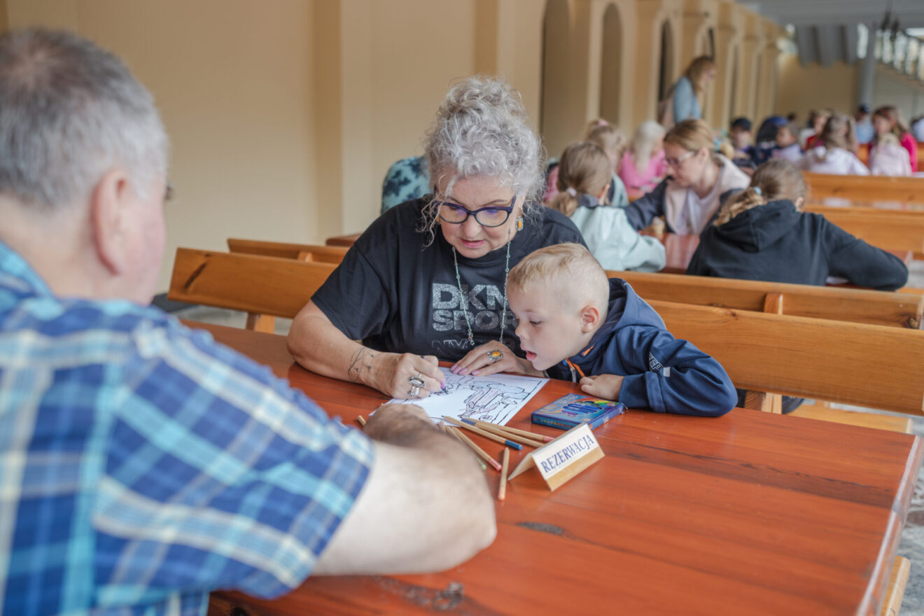 Po Eucharystii duchowe doświadczenie kontynuowano w przestrzeni radości i kreatywności. Dzieci – a wraz z nimi ich rodziny – uczestniczyły w warsztatach plastycznych przygotowanych przez ks. Adama Stankiewicza MIC i pracowników sanktuarium. Tematem przewodnim były objawienia Matki Bożej Licheńskiej. Dzieci kolorowały, słuchały opowieści, brały udział w zabawach integracyjnych. Nie brakowało śmiechu, skupienia i… poczucia bycia razem, we wspólnocie.