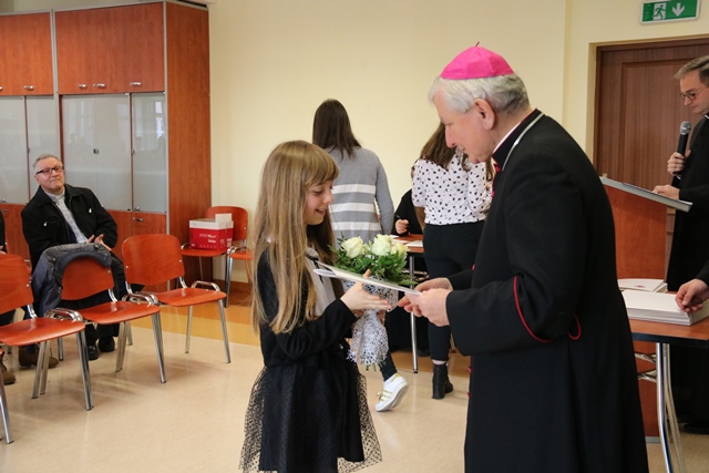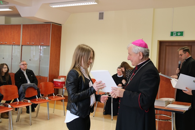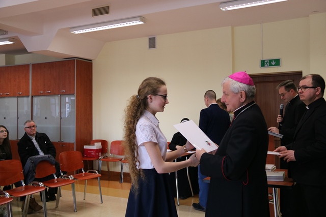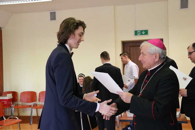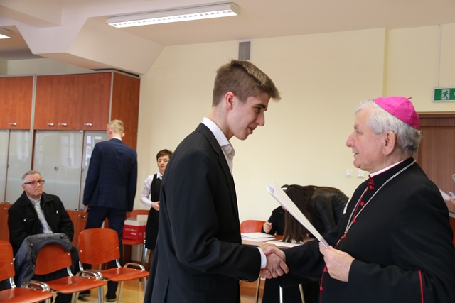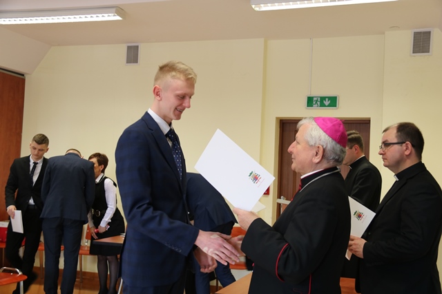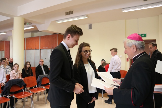Fot. Ewa Kotowska-Rasiak75 uczniów oraz studentów z diecezji kaliskiej, w tym 8 uczniów Zespołu Szkół Technicznych Diecezji Kaliskiej odebrało dziś stypendia im. św. Jana Pawła II. Wręczył je bp Edward Janiak.