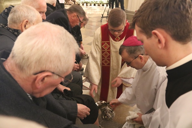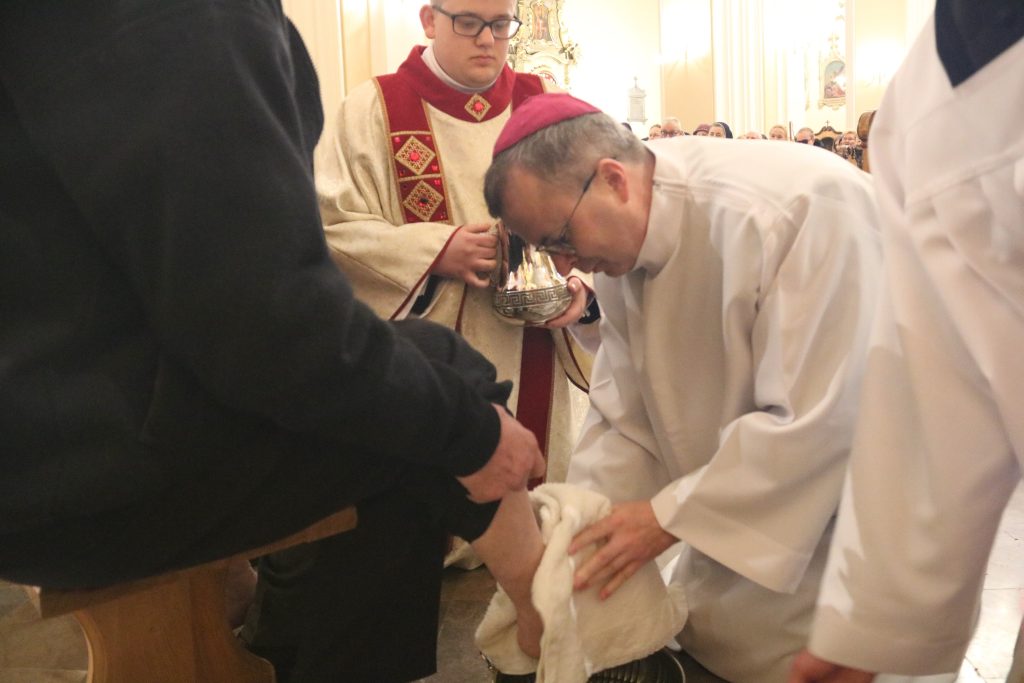 Podczas liturgii Wielkiego Czwartku bp Damian Bryl obmył nogi dwunastu mężczyznom – przedstawicielom parafian katedry św. Mikołaja w Kaliszu.