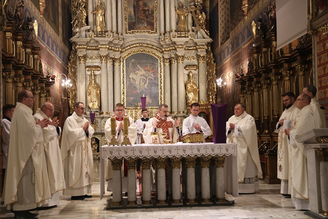 Fot. Ewa Kotowska-Rasiak/KAIBiskup kaliski Damian Bryl przewodniczył Mszy Wieczerzy Pańskiej w katedrze św. Mikołaja w Kaliszu. – W Eucharystii Chrystus pragnie umacniać naszą wiarę w obliczu licznych zagrożeń, jakie niesie współczesny świat, który wciąż szuka nowych sposobów, aby człowieka oderwać od Boga, aby ze światła prawdy i dobra skierować go w ciemność zła – mówił w homilii ks. prał. Adam Modliński.