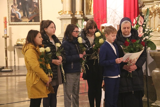 Po komunii św. dzieci złożyły życzenia biskupowi i kapłanom z okazji ustanowienia Sakramentu Kapłaństwa.