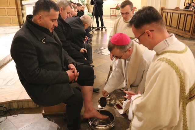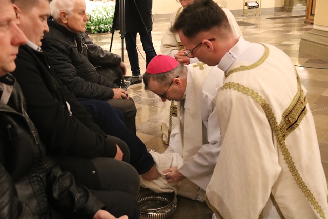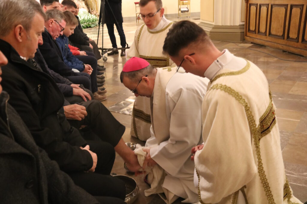 Podczas liturgii Wielkiego Czwartku bp Damian Bryl obmył nogi dwunastu mężczyznom – przedstawicielom parafian katedry św. Mikołaja w Kaliszu.