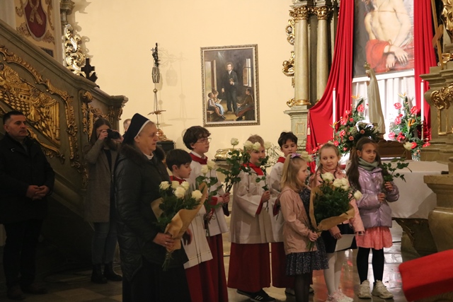 Po komunii św. z okazji ustanowienia Sakramentu Kapłaństwa. dzieci złożyły życzenia biskupowi kaliskiemu Damianowi Brylowi i biskupowi pomocniczemu Łukaszowi Buzunowi oraz obecnym kapłanom.
