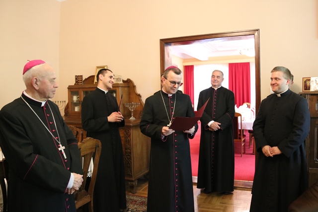 Po zakończonej uroczystości bp Damian Bryl w obecności bpa seniora Stanisława Napierały i duchowieństwa wręczył dekrety kierujące na pierwsze parafie.