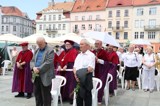 Fot. Ewa Kotowska-RasiakBiskup kaliski Edward Janiak przewodniczył uroczystości Bożego Ciała w Kaliszu. – Stajemy dzisiaj w tym miejscu, żeby Boga obecnego w Eucharystii, wędrującego po ulicach Kalisza, pytać jak żyć, jak Mu się podobać, jak kochać braci i siostry w swojej codzienności – mówił w homilii bp Łukasz Buzun, który odprawił Mszę św. na rynku.