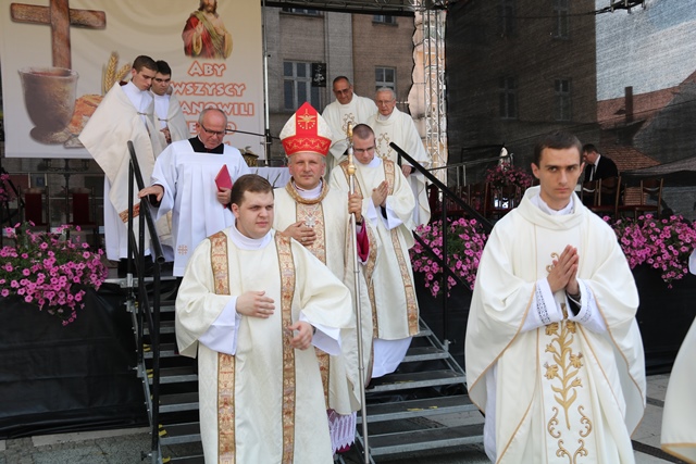 Po zakończeniu procesji Mszy św. na rynku przewodniczył bp Łukasz Buzun w asyście księży neoprezbiterów i licznie zgromadzonych kapłanów.
