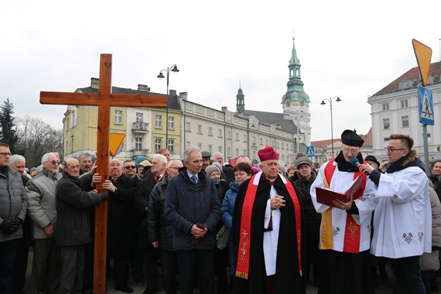 Droga krzyżowa rozpoczęła się przy Grocie Katyńskiej na placu przy Sanktuarium Serca Jezusa Miłosiernego Ojców Jezuitów. Tegoroczne nabożeństwo poświęcono małżonkom i rodzinom. – „Rodzina dzisiaj w naszej ojczyźnie i na całym świecie jest zagrożona. Przeżywa kryzysy, często rozpada się. Małżeństwa mają swoją drogę krzyżową. Potrzebna jest modlitwa, dlatego w tej drodze krzyżowej ulicami Kalisza pragniemy objąć małżonków, tych młodych i ze starszym stażem wiekowym” – mówił bp Stanisław Napierała rozpoczynając wielkopostne nabożeństwo.