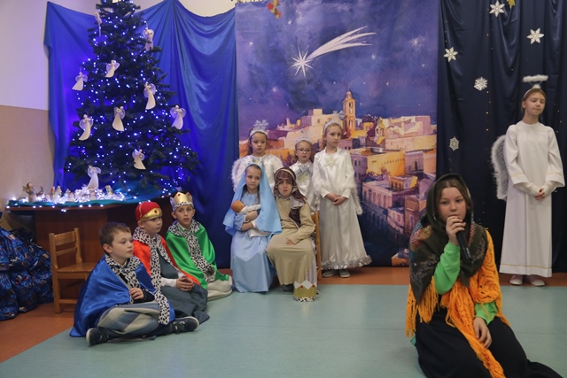 Fot. Ewa Kotowska-Rasiak/KAIDzieci uczęszczające do świetlicy socjoterapeutycznej „Nazaret” w Kaliszu prowadzonej przez Zgromadzenie Sióstr Najświętszej Rodziny z Nazaretu wystawiły jasełka. Przedstawienie obejrzał biskup kaliski Damian Bryl, który pogratulował dzieciom występu.