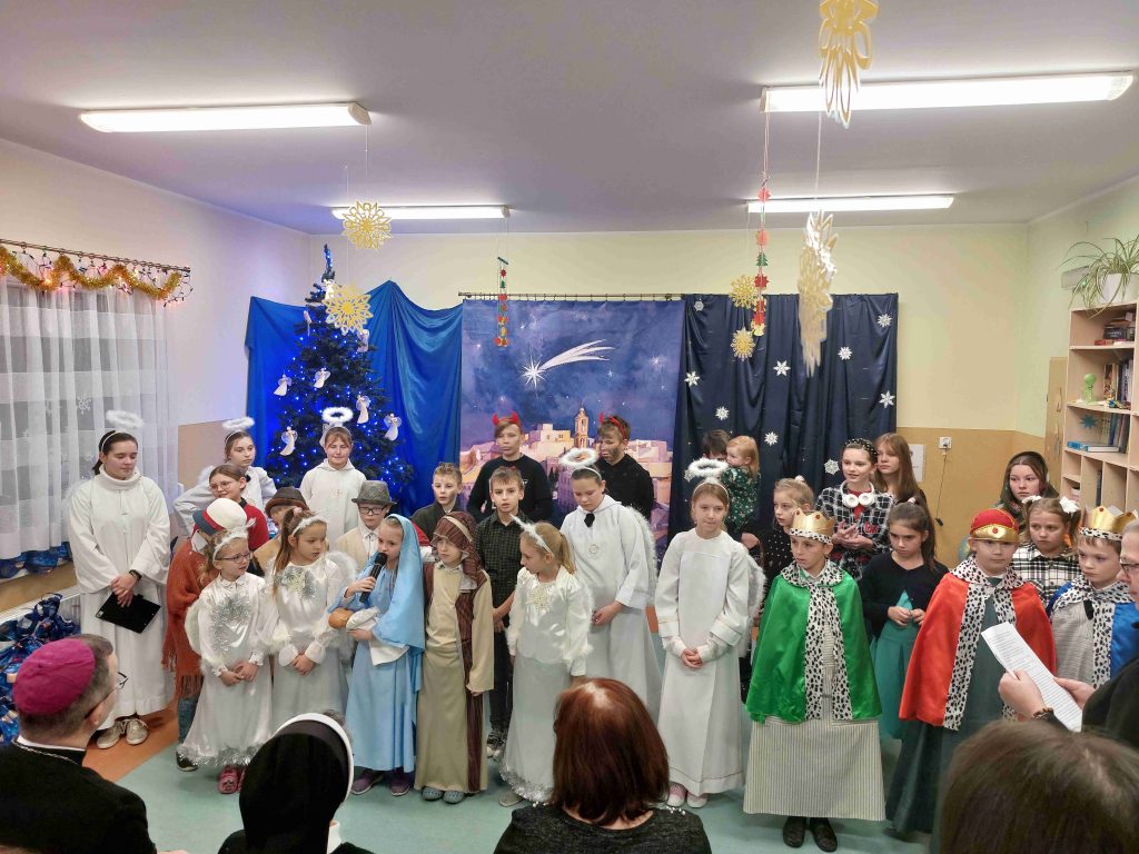 Fot. Ewa Kotowska-Rasiak/KAIDzieci uczęszczające do świetlicy socjoterapeutycznej „Nazaret” w Kaliszu prowadzonej przez Zgromadzenie Sióstr Najświętszej Rodziny z Nazaretu wystawiły jasełka. Przedstawienie obejrzał biskup kaliski Damian Bryl, który pogratulował dzieciom występu.