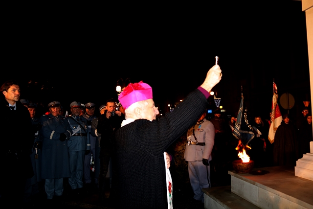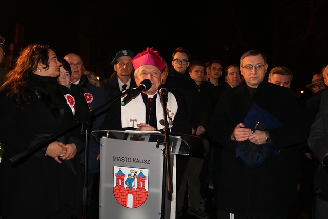 Podkreślał, że posąg będzie przypominał mieszkańcom Kalisza, że po 123 latach nie istnienia na mapie Europy w końcu zabłysnął na niej znak państwa polskiego. – Ilekroć będziemy przechodzić obok tego monumentu warto przypomnieć sobie, jak Polska wstawała z kolan, jak odradzała się jej niepodległość, jak polski naród zaczął wreszcie oddychać wolnością pełną piersią. U początku odzyskania przez Polskę niepodległości stanął marszałek Józef Piłsudski, który chciał budować Polskę jako państwo wolne, suwerenne i demokratyczne – mówił hierarcha.