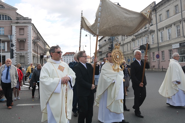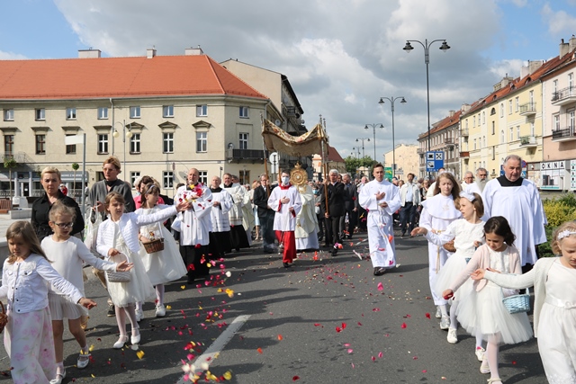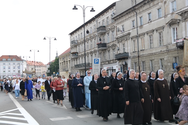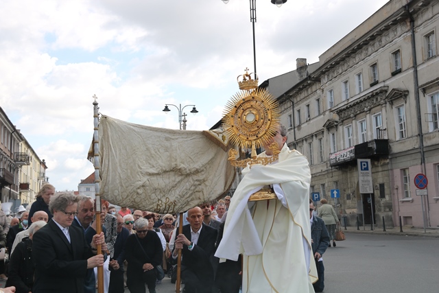 Na skrzyżowaniu ulic 3 Maja, Warszawskiej, Stawiszyńskiej i pl. Kilińskiego bp Damian Bryl udzielił błogosławieństwa Najświętszym Sakramentem na cztery strony świata.