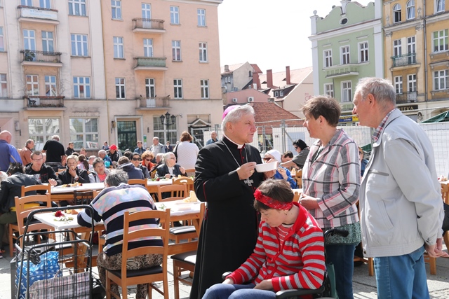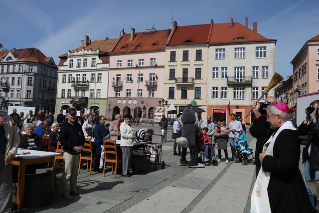 Fot. Ewa Kotowska-RasiakNa nadchodzące święta Zmartwychwstania Pańskiego życzę błogosławieństwa Bożego, zdrowia, dobrych ludzi na waszej drodze życia, abyście nie czuli się samotni i opuszczeni – mówił bp Edward Janiak podczas śniadania świątecznego na kaliskim Rynku. Biskup kaliski pobłogosławił potrawy wielkanocne i wspólnie z zebranymi zasiadł do stołu.