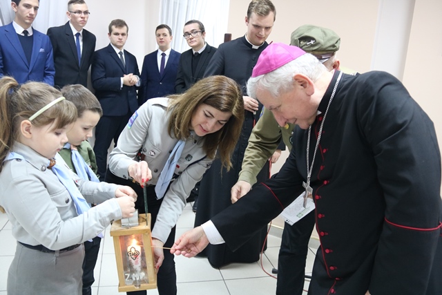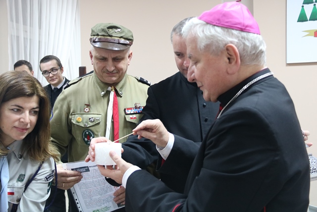 Podczas wieczerzy wigilijnej harcerze przekazali bp. Edwardowi Janiakowi Betlejemskie Światło Pokoju.