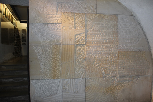 Na tylnej ścianie kaplicy znajduje się ryty w piaskowcu relief przedstawiający krzyż, u którego stóp widoczne są postacie więźniów. – Jeden z nich, w męce konania podtrzymywany jest przez współbrata, zaś trzeci stoi obok krzyża, z ręką wzniesioną ku górze i zdaje się wołać Sursum Corda, wskazując jednocześnie drugą ręką na znajdujący się obok tekst z nazwami wszystkich polskich, przedwojennych diecezji i zgromadzeń zakonnych – czytamy w przewodniku.