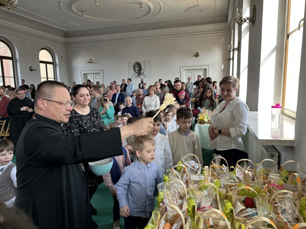 „Panie Jezu dziękujemy Ci za Święta Wielkanocne, które nadchodzą. Dziękujemy Ci za to, że możemy je przeżywać nie tylko w kościele, ale też w domu. Możemy je przeżywać nie tylko przy ołtarzu, ale też przy stole. Dziękujemy ci Jezu za to, że będziesz razem z nami przy tym stole siedział i że możemy od Ciebie wziąć pokarmy, które nam przypominają Twoją obecność, dlatego prosimy Cię abyś je teraz pobłogosławił”- powiedział do zgromadzonych dzieci i ich rodziców Ksiądz Kardynał w trakcie błogosławieństwa wielkanocnych koszyczków.
