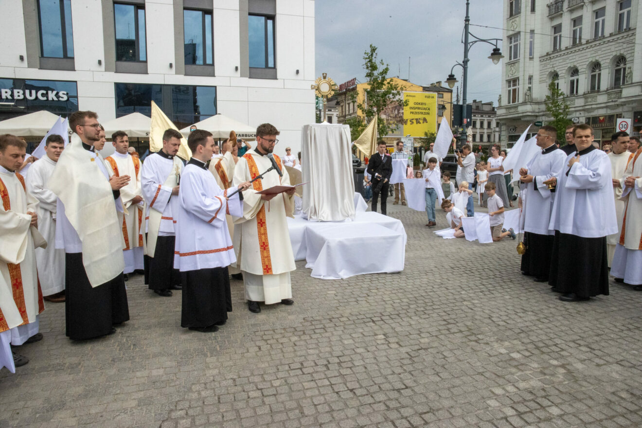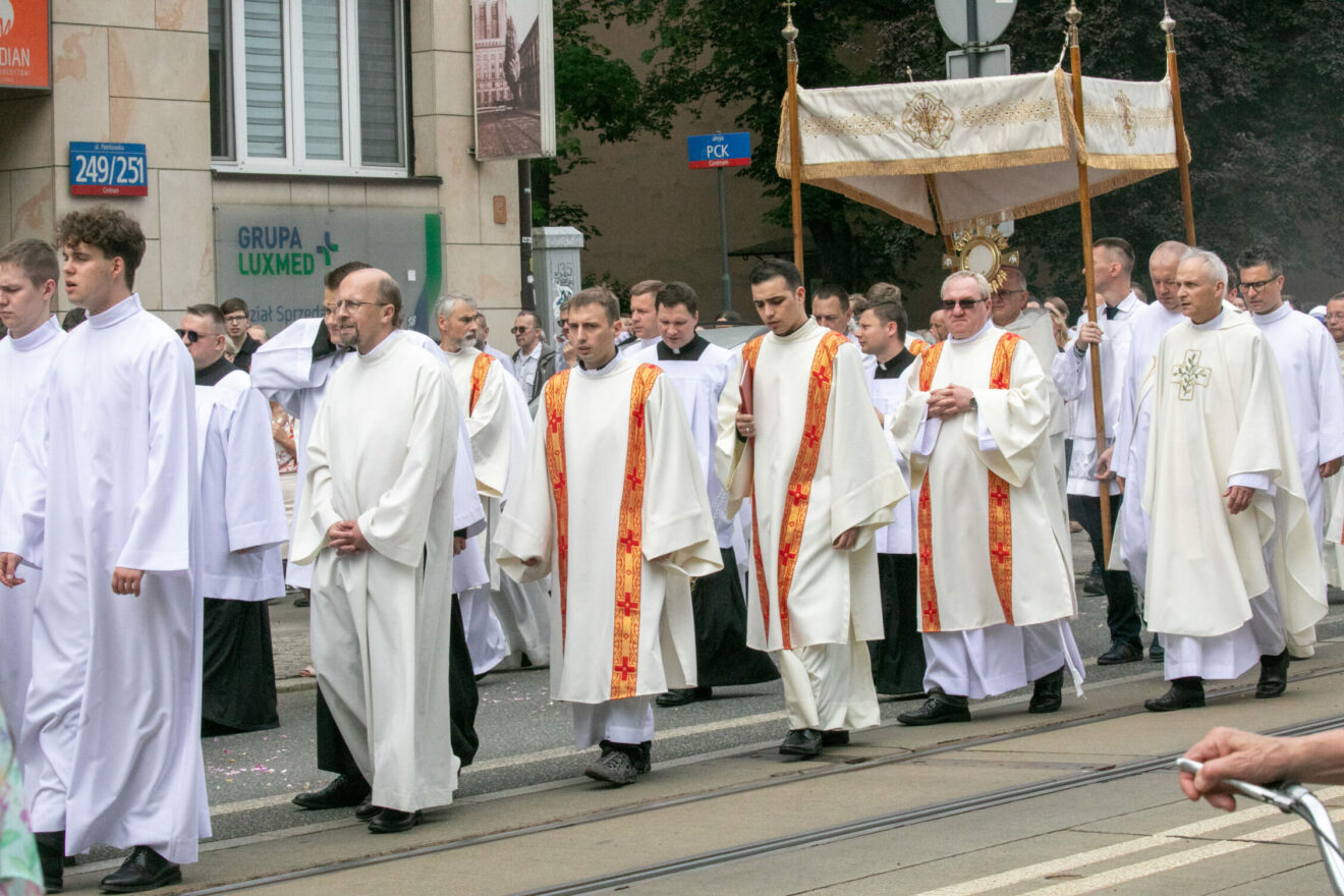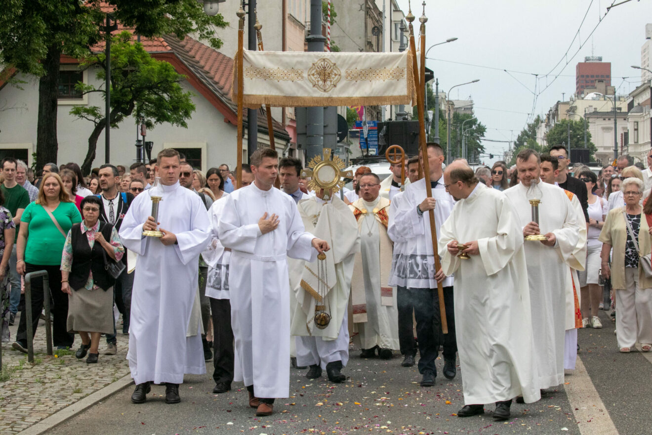 W uroczystość Najświętszego Ciała i Krwi Pańskiej przez centrum Łodzi przeszła uroczysta procesja, która zgromadziła we wspólnocie modlitwy duchownych i wiernych czterech śródmiejskich parafii: p.w. Matki Boskiej Zwycięskiej, Podwyższenia Krzyża Świętego, Najświętszego Imienia Jezus oraz katedry p.w. św. Stanisław Kostki.