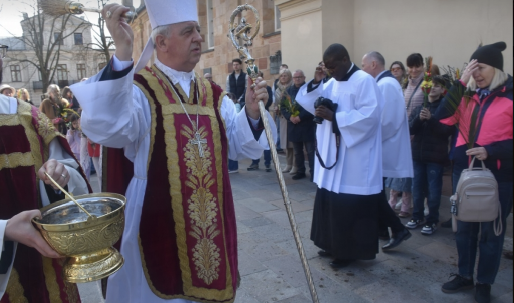 Przed rozpoczęciem Eucharystii, wokół bazyliki katedralnej przeszła uroczysta procesja, prowadzona przez biskupa kieleckiego i kapłanów. Bp Piotrowski poświęcił palmy, a w słowie skierowanym do wiernych, nawiązał do chrześcijańskiej nadziei i radości ze Zmartwychwstania, niosącego pokój.