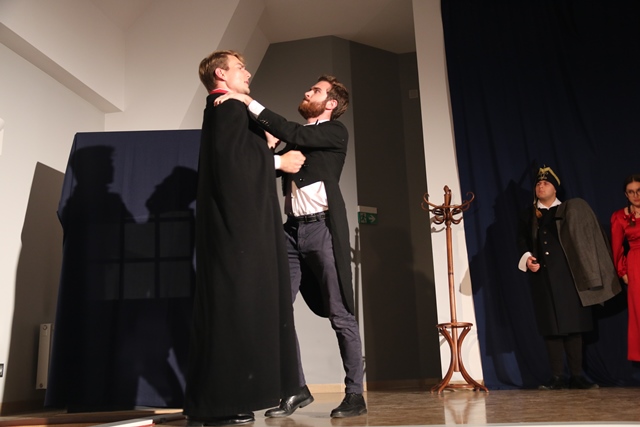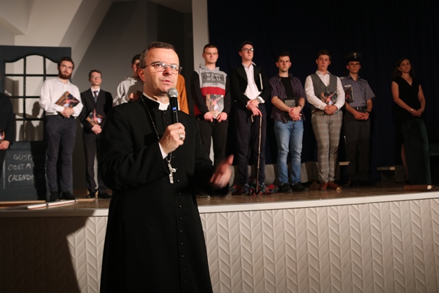 Fot. Ewa Kotowska-Rasiak/KAIKlerycy roku propedeutycznego formujący się w Wyższym Seminarium Duchownym w Kaliszu wystawili spektakl „Śmierć porucznika” Sławomira Mrożka w reżyserii Tomasza Mielocha. Spektakl obejrzeli: biskup kaliski Damian Bryl oraz rodzice, rodzeństwo i dziadkowie aktorów.
