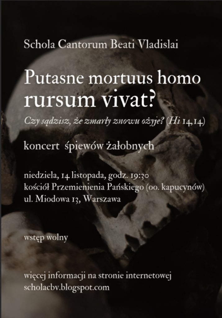 Fot. scholacbv.blogspot.comW niedzielę 14 listopada o godzinie 19:30 w kościele Przemienienia Pańskiego (oo. kapucynów) w Warszawie odbędzie się koncert śpiewów żałobnych w wykonaniu Scholae Cantorum Beati Vladislai. Wydarzenie zatytułowane „Putasne mortuus homo rursum vivat” (Czy sądzisz, że umarły znowu ożyje? Hi 14, 14) wpisuje się w listopadową modlitwę za wiernych zmarłych i towarzyszącą jej refleksję nad rzeczami ostatecznymi.