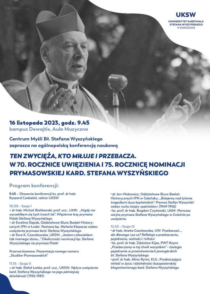 For. UKSWCentrum myśli bł. Stefana Wyszyńskiego zaprasza na ogólnopolską konferencję naukową „Ten zwycięża, kto miłuje i przebacza. W 70. rocznicę uwięzienia i 75. rocznicę nominacji prymasowskiej kard. Stefana Wyszyńskiego”. Spotkanie odbędzie się 16 listopada w Auli Muzycznej na kampusie UKSW przy ul. Dewajtis.