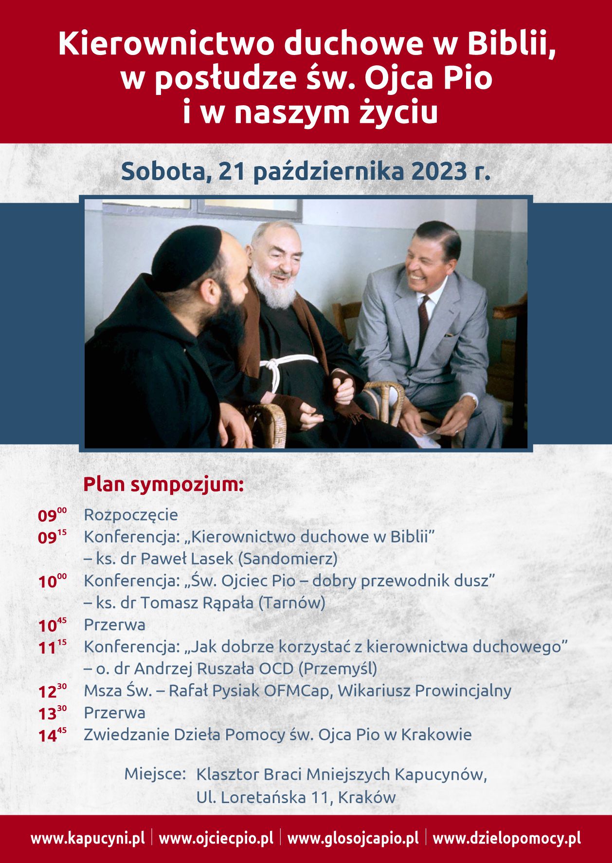 Konferencja „Kierownictwo duchowe w Biblii, w posłudze św. Ojca Pio i w naszym życiu” odbędzie się w sobotę 21 października w klasztorze braci kapucynów przy ul. Loretańskiej 11 w Krakowie. O kierownictwie duchowym w Biblii będzie mówił ks. dr Paweł Lasek z Sandomierza, o Ojcu Pio jako „dobrym przewodniku dusz” – ks. dr Tomasz Rąpała z Tarnowa, a konferencję „Jak dobrze korzystać z kierownictwa duchowego” wygłosi o. dr Andrzej Ruszała, karmelita z Przemyśla.