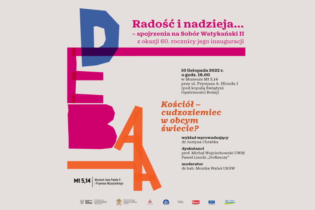 „Kościół – cudzoziemiec w obcym świecie?” to tytuł kolejnej debaty organizowanej w ramach 60. rocznicy Soboru Watykańskiego II, która odbędzie się w czwartek 10 listopada w Muzeum Jana Pawła II i Prymasa Wyszyńskiego w Warszawie. Cykl spotkań pod wspólnym tytułem „Radość i nadzieja” jest zaproszeniem do rozmowy ludzi mających różne wizje Kościoła i odmienną wrażliwość eklezjalną. Jednym z patronów medialnych wydarzenia jest Katolicka Agencja Informacyjna.