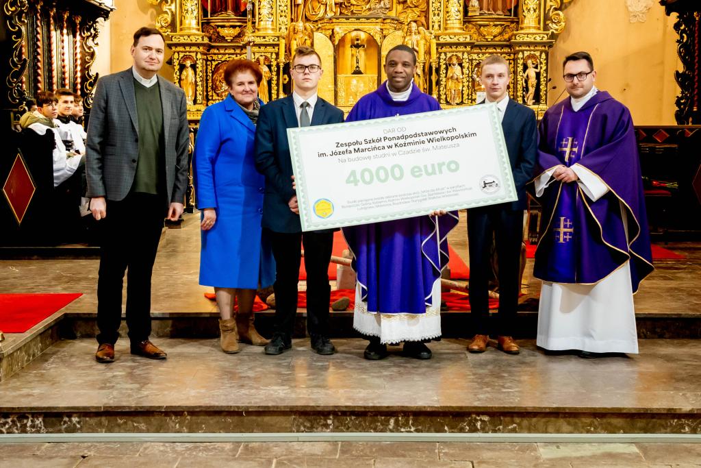 Na ręce o. Erica Kossi Hounake SVD, który prowadził rekolekcje wielkopostne dla młodzieży, czek przekazała dyrektor szkoły Ilona Bałoniak. Pieniądze wesprą budowę studni św. Mateusza w Togo. Wcześniej, w grudniu 2023 r., 8 tys. euro trafiło do Togo na studnię św. Wawrzyńca.
