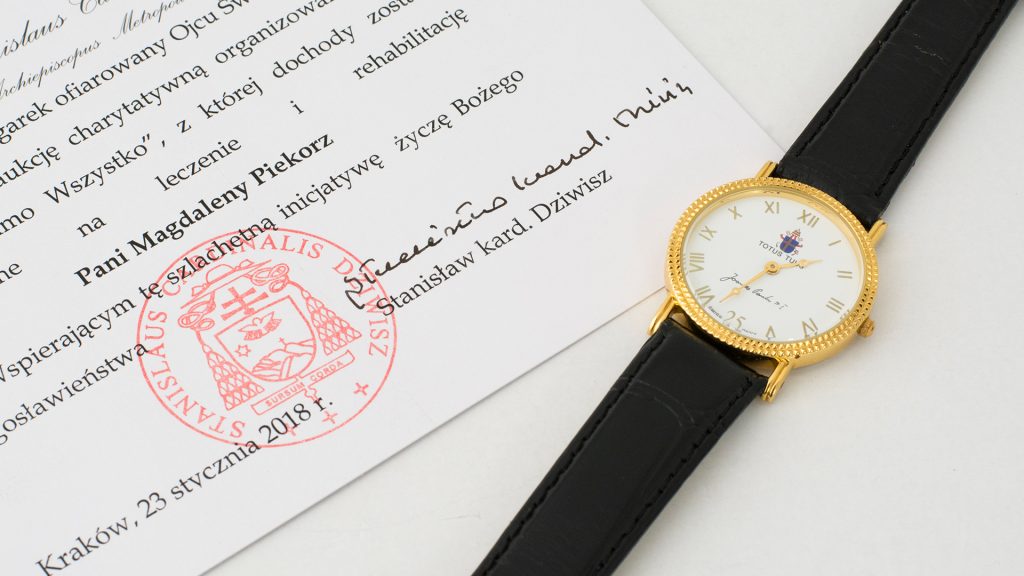 Na tarczy szwajcarskiego zegarka umieszczony jest herb Jana Pawła II, jego podpis oraz napis „Totus Tuus”. Pamiątka została przekazana na aukcję przez kard. Stanisława Dziwisza. Podczas wydarzenia organizowanego przez Fundację Anny Dymnej „Mimo wszystko” wylicytowano również pióra od abp. Marka Jędraszewskiego, Jarosława Kaczyńskiego, premiera Mateusza Morawieckiego czy prezydenta Aleksandra Kwaśniewskiego.