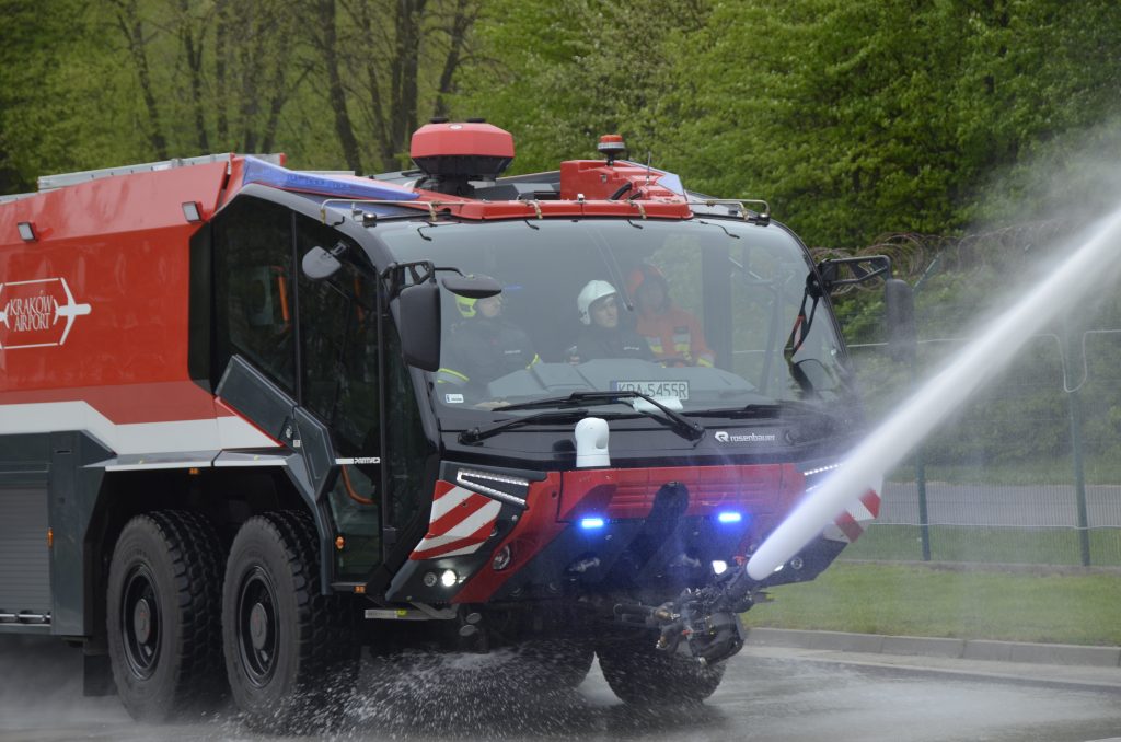 Po uroczystym apelu przyszedł czas na poświęcenie nowego lotniskowego samochodu ratowniczo – gaśniczego typ 8×8. Prezes Kraków Airport Radosław Włoszek dziękował strażakom za ich wytrwałość i na konkretnych przykładach z pracy lotniska pokazywał jak wielkim bohaterstwem jest uratowanie ludzkiego życia. Dodał, że nowy wóz strażacki posiada najnowsze technologie służące do podawania środków gaśniczych i jest jednym z najlepszych modeli tego typu.