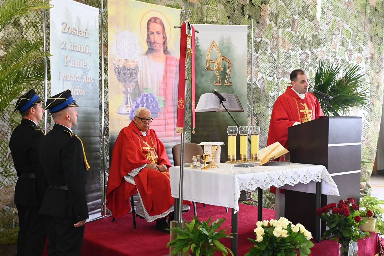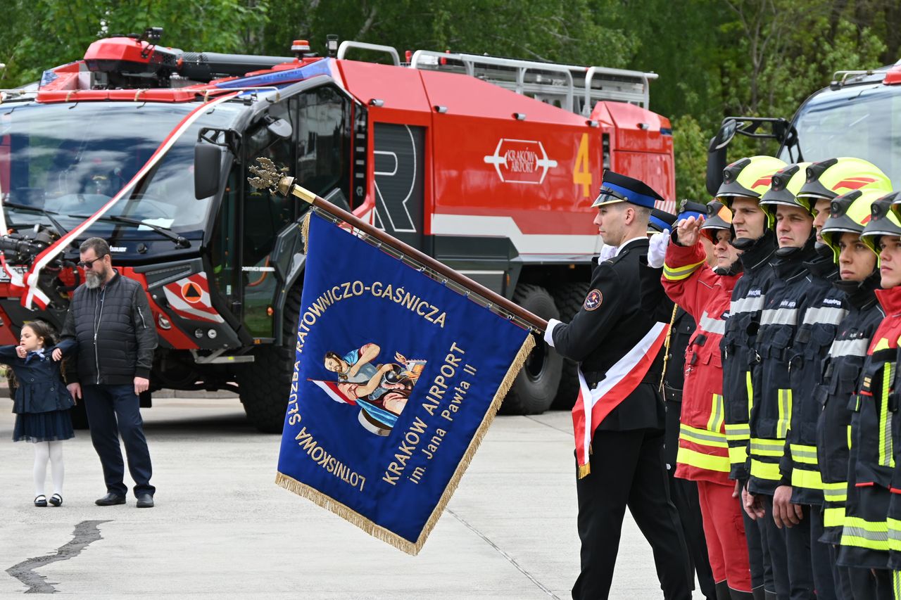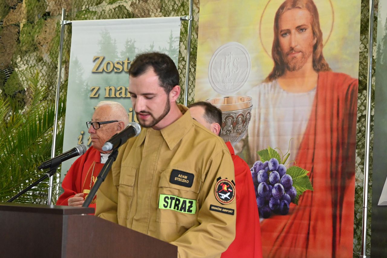 Fot. Jan Głąbiński – Jesteście najważniejszą służbą na świecie. Dzisiaj w czasie Mszy św. pierwszy raz wspominamy papieża Leona XIV. A przed konklawe to właśnie strażacy montowali komin na Kaplicy Sykstyńskiej, na który potem patrzył cały świat – mówił ks. Mieszko Ćwiernia, kapelan Kraków Airport, gdzie dziś odbyły się obchody Dnia Strażaka.