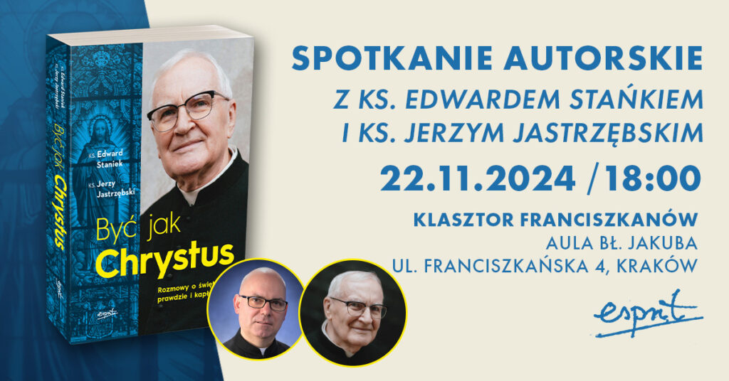Wydawnictwo Esprit zaprasza na spotkanie autorskie z ks. Edwardem Stańkiem oraz ks. Jerzym Jastrzębskim wokół ich najnowszej książki „Być jak Chrystus. Rozmowy o świętości, prawdzie i kapłaństwie”. Spotkanie odbędzie się 22 listopada w klasztorze franciszkanów w Krakowie.