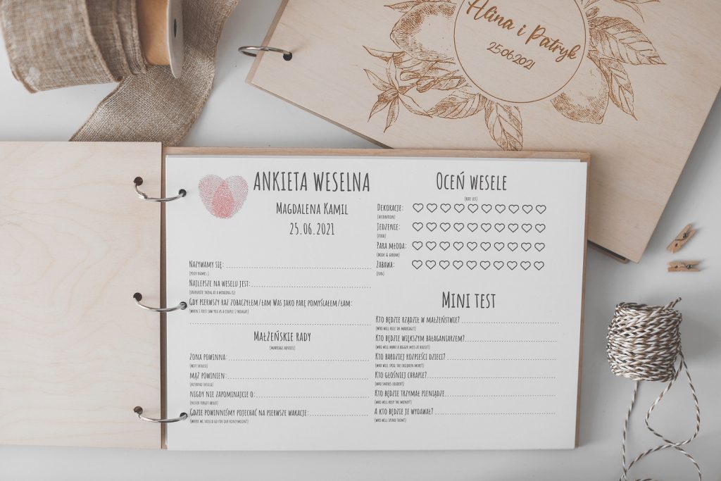 Księga gości z ankietami to kolejna forma ciekawej pamiątki, z przygotowanymi pytaniami oraz miejscem na porady dla pary młodej. Ankiety ślubne sprawią, że goście będą mieli kreatywną i wesołą atrakcję. Przystępność pytań zawartych w ankiecie sprawia, że wypełnia się je z przyjemnością. Z pewnością powrót do tak zachowanych wspomnień wywoła łzy wzruszenia jak i śmiechu.