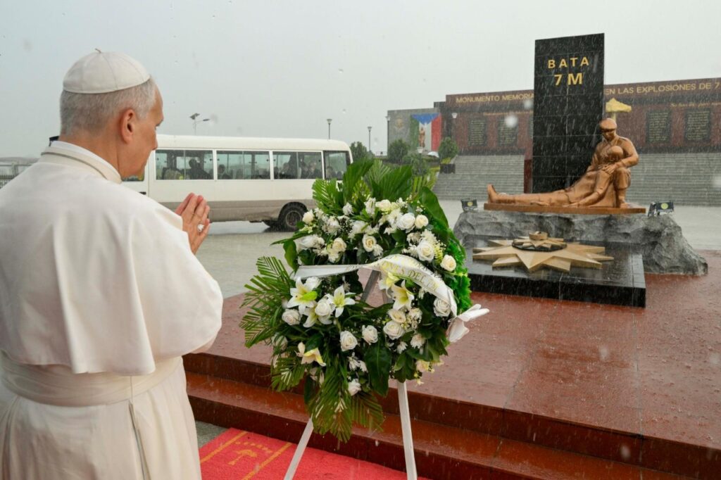 Fot. Vatican MediaLeon XIV modlił się przy pomniku upamiętniającym ofiary wybuchu z 7 marca 2021 r. w Bata, w Gwinei Równikowej.