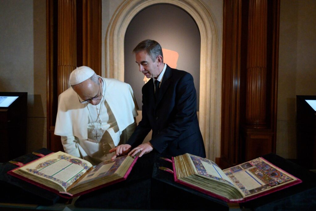 Sam Toniato wyjaśnił Papieżowi przebieg ekspozycji, opowiadającej o genezie tego dzieła, oraz zaprezentował egzemplarz udostępniony zwiedzającym, aby mogli kartkować rękopis (oryginał wystawiony jest w gablocie). Także Leon XIV dotknął kart tej Biblii.