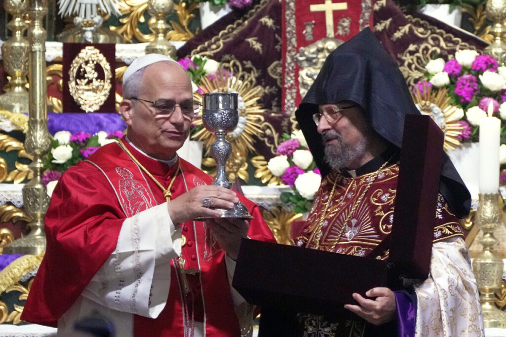 Leon XIV otrzymał w darze kielich mszalny. Z kolei papież podarował ormiańskiemu patriarchatowi mozaikę przedstawiająca krzyż grecki, który charakteryzują cztery ramiona tej samej długości. Umieszczone tam greckie litery I i X są skrótem słów „Jezus” i „Chrystus”, a litery M i Θ – słów „Matka” i „Boża”. Dzieło powstało w watykańskim Studiu Mozaik. Wykonano je techniką z XVII wieku.