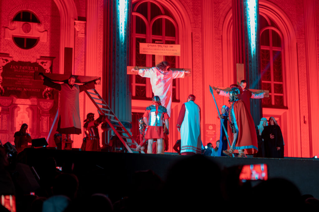 Plac przed świątynią już przed rozpoczęciem przedstawienia wypełniła atmosfera skupienia. Uczestnicy byli świadkami kolejnych etapów ostatnich chwil ziemskiego życia Jezusa – od Ostatniej Wieczerzy, przez modlitwę w Ogrójcu, proces i drogę krzyżową, aż po śmierć na Golgocie i poranek Zmartwychwstania. Sceny ukazano z dbałością o przekaz Ewangelii oraz emocjonalny wymiar wydarzeń.