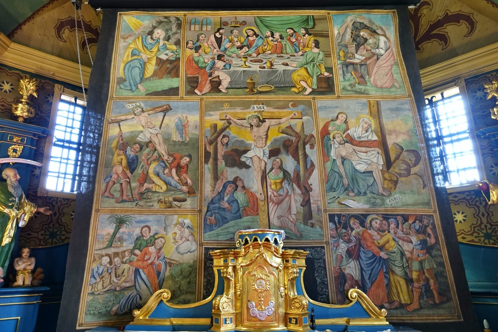 Fot. Robert Karp/diecezja.bielsko.plUnikalna zasłona wielkopostna – tkanina o wymiarach 400 x 400 cm – zawisła na ołtarzem drewnianej świątyni pw. śś. Apostołów Szymona i Judy Tadeusza w Łodygowicach na Żywiecczyźnie. Zgodnie z pradawną tradycją Kościoła w czasie Wielkiego Postu zasłania się wizerunki krzyża świętego, a niegdyś zasłaniano całe ołtarze. Łodygowicka świątynia należy do Muzeum Rozproszonego Diecezji Bielsko-Żywieckiej (MuRo).