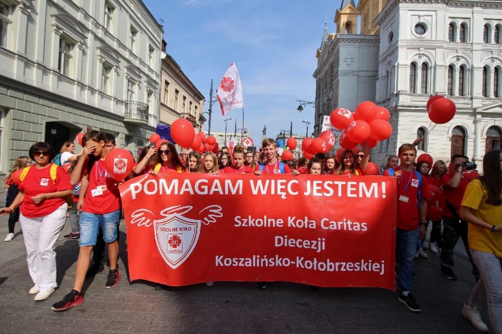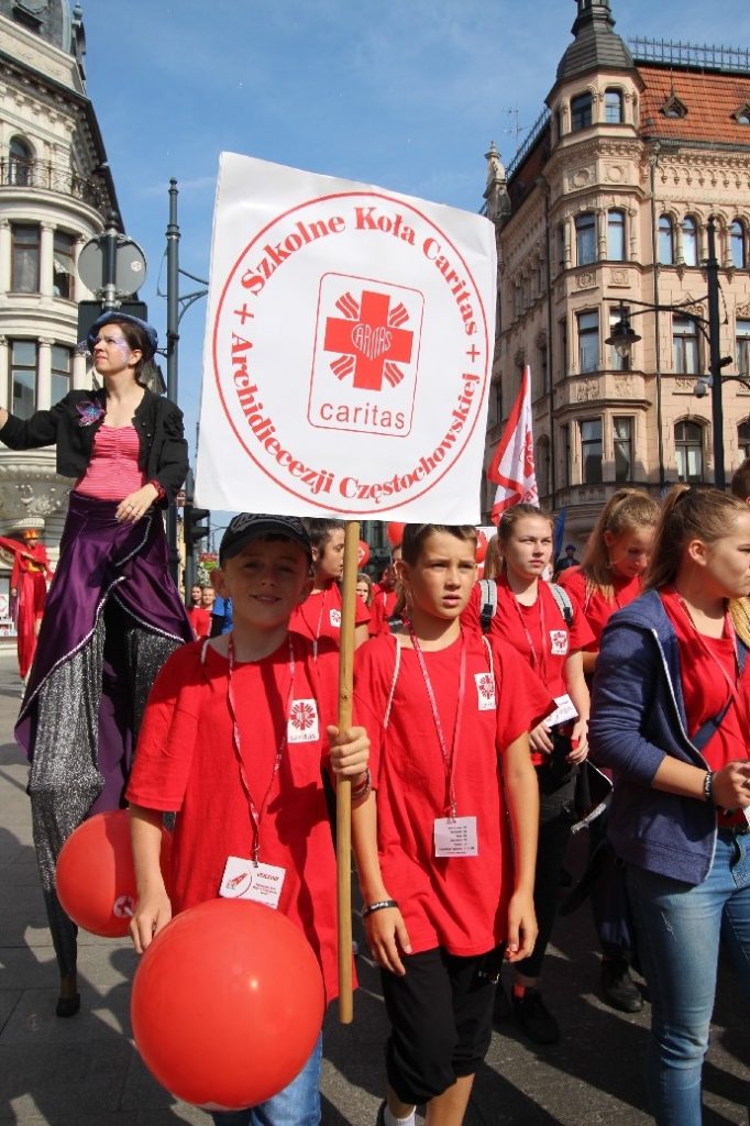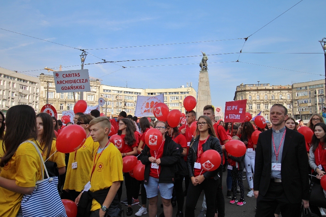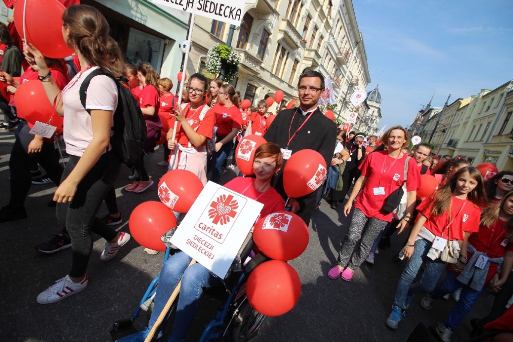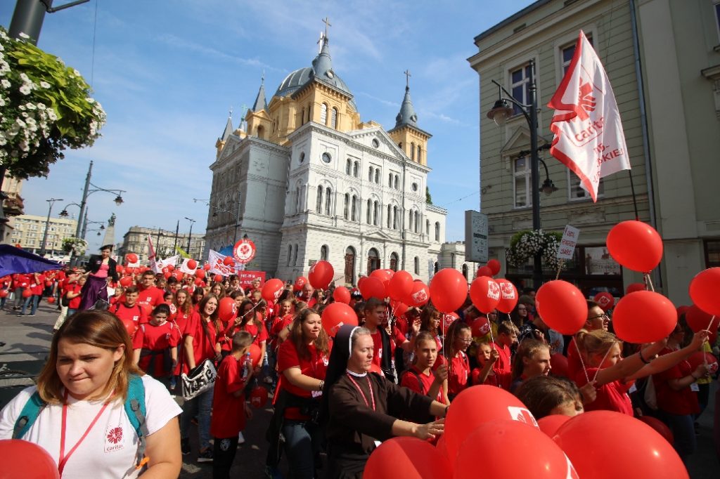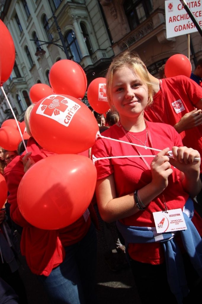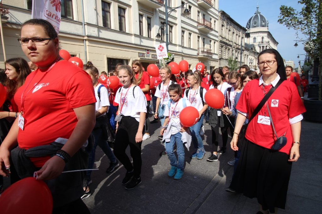 Młodzi ubrani w czerwone koszulki z napisem „Caritas”, niosąc czerwone balony i transparenty przeszli ulicą Piotrkowską, śpiewając i tańcząc przy akompaniamencie jezuickiego zespołu „Mocni w Duchu”, działającego przy ośrodku Odnowy w Duchu Świętym w Łodzi.