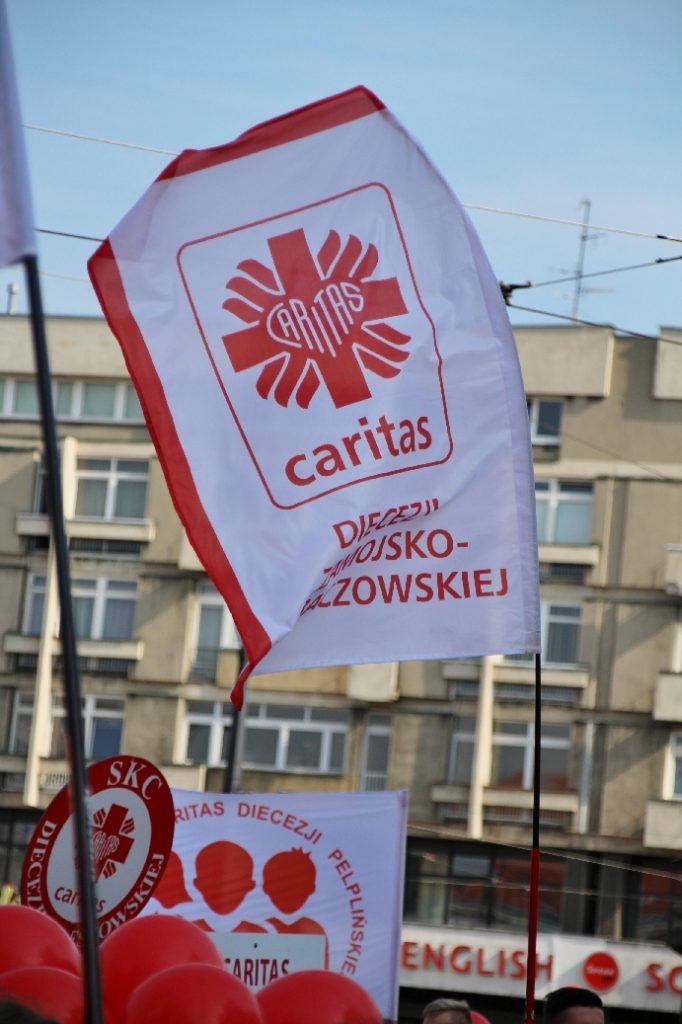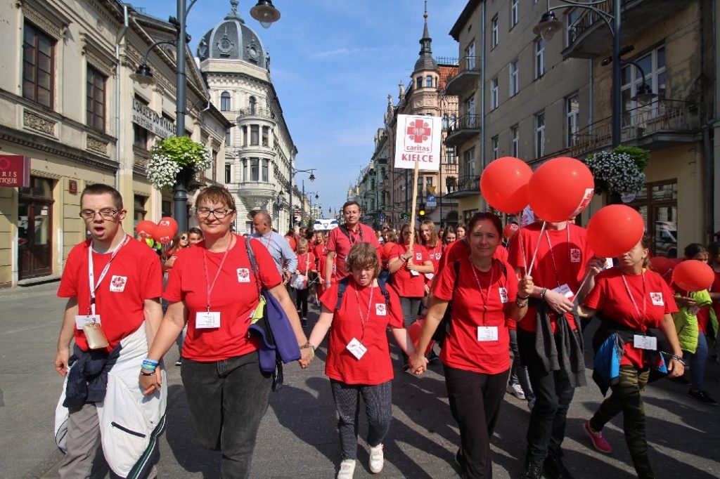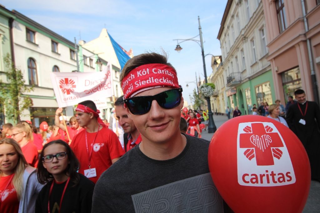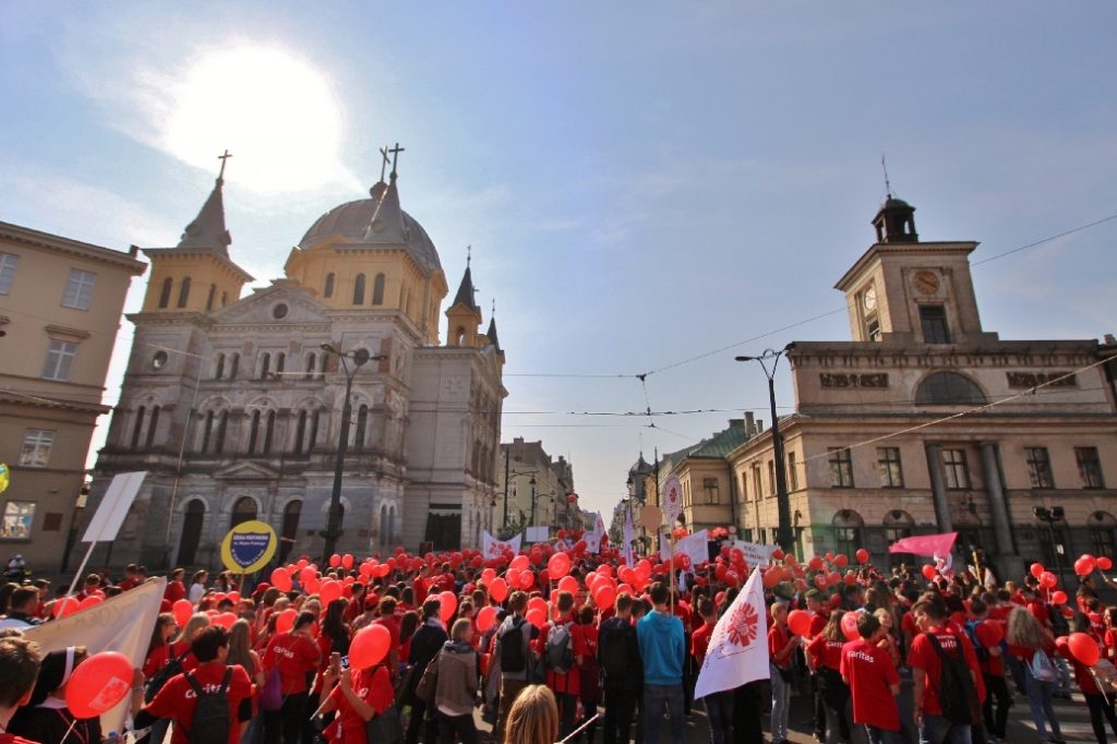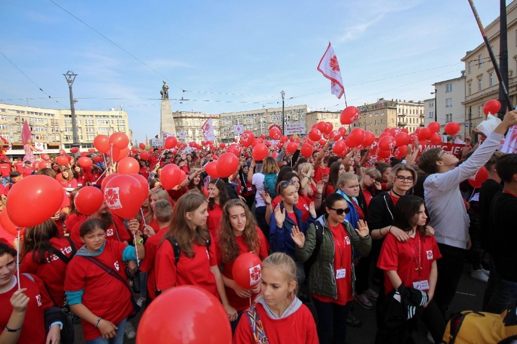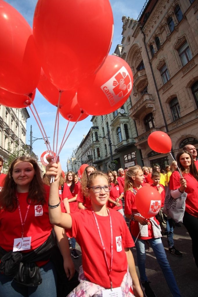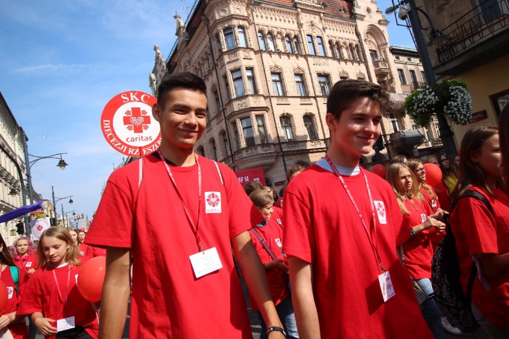 Młodzi ubrani w czerwone koszulki z napisem „Caritas”, niosąc czerwone balony i transparenty przeszli ulicą Piotrkowską, śpiewając i tańcząc przy akompaniamencie jezuickiego zespołu „Mocni w Duchu”, działającego przy ośrodku Odnowy w Duchu Świętym w Łodzi.